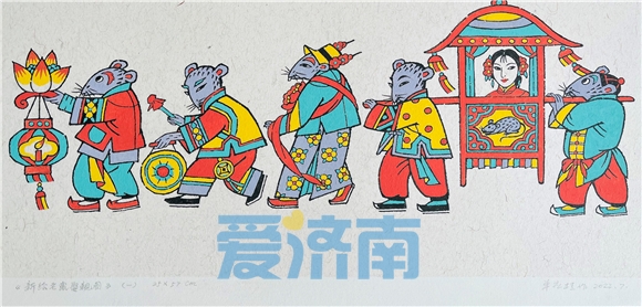 单应桂年画作品丨《老鼠娶亲》年画,几乎牵绊了单应桂的一生。她与年画结缘,要追溯到单应桂的幼年时期。她本是在济南城中长大的孩子,却因为战争而逃难到农村。八年的逃亡经历,她苦中觅乐,从年画这种民间艺术中汲取养分。“我对年画的喜爱是情不自禁的,小的时候看《老鼠娶亲》,在幼小的心灵上是永远忘不了的东西。”
