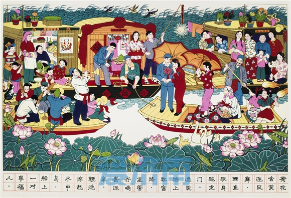 单应桂年画作品丨《湖上婚礼》实际上,民间艺术并非不能登大雅之堂,从齐白石、吴昌硕等大师的画中,都能感受到民间艺术的滋养和韵味。单应桂非常喜欢年画中的那种大红大紫大绿,认为这种强烈明快的颜色光彩夺目。