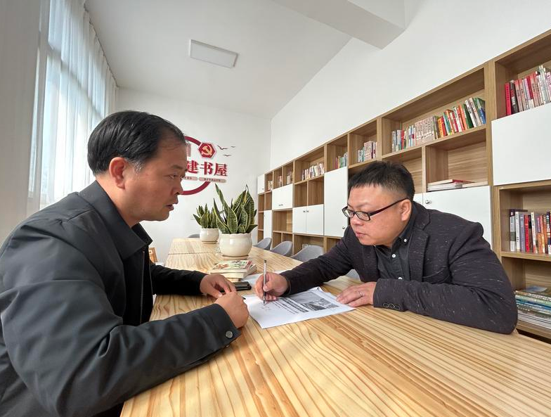 哑柏镇镇长谢宏亮和设计师金仁卫(右)正在商讨村子建设事宜