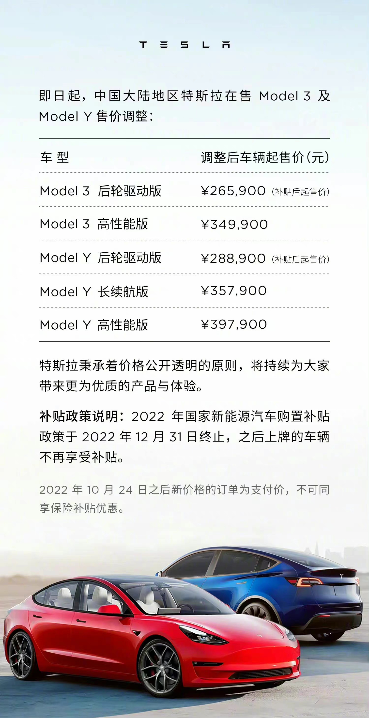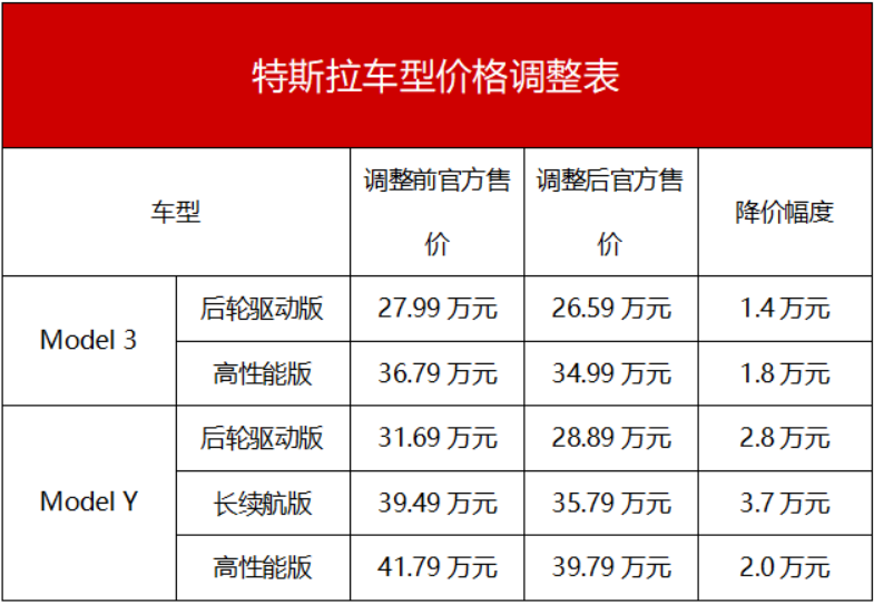10月24日一早,特斯拉官方突然宣布降价,此次价格调整幅度最高达到了3.7万元,直接让Model 3和Model Y车型来到了今年售价的最低位,仅高于今年元旦第一波涨价之前的售价。其中,Model 3后驱版本由27.99万元降至26.59万元,高性能版36.79万元降至34.99万元。Model Y后驱版从31.69万元降至28.89万元,长续航版降至35.79万元,高性能版降至39.79万元。