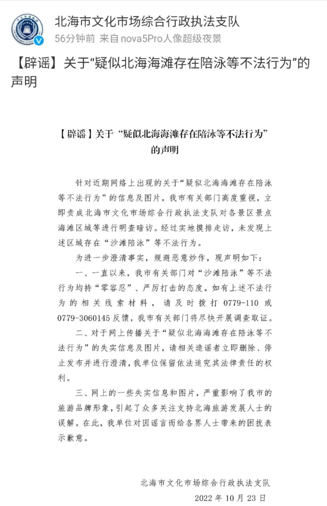 经有关部门实地摸排走访,未发现上述区域存在“沙滩陪游”等不法行为,此信息为谣言。