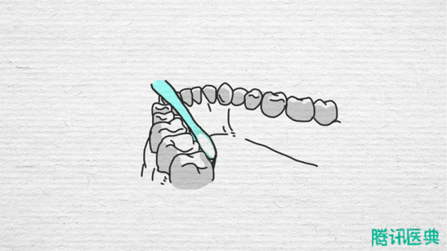 刷咬合面时,让刷毛与牙面垂直就好,注意不要漏刷上下最后一颗牙的后面。
