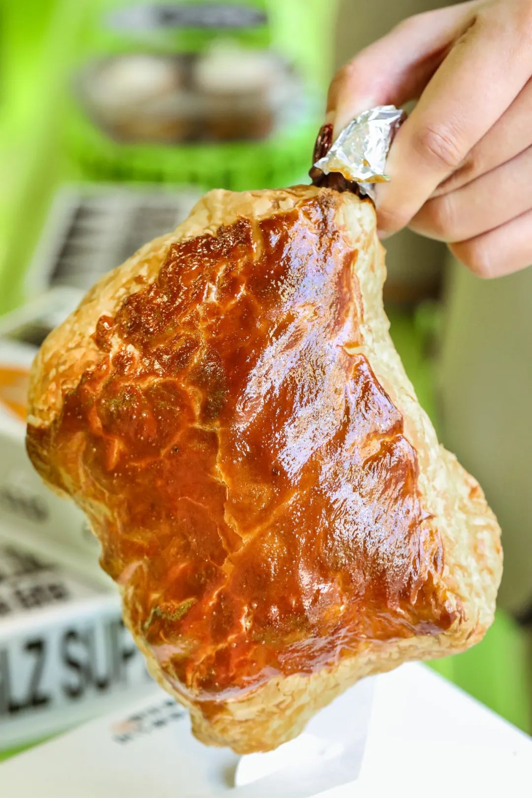 酥皮手枪鸡腿包,光看外形就被吸引住了,鼓鼓囊囊的大鸡腿十分吸睛,精选优质黄油,纯手工制作的酥皮裹在鸡腿外部,拿起来沉甸甸地分量十足。