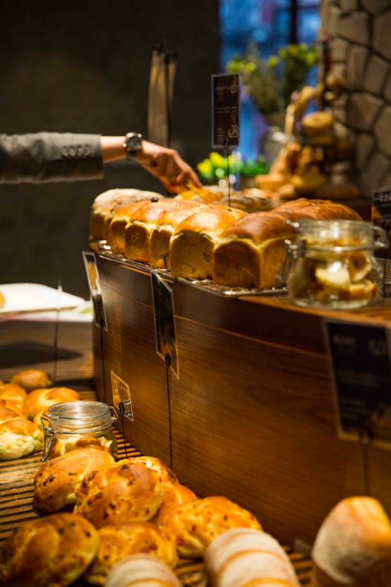 随处可见的酿酒桶,让人一进来就想一醉方休。Briant石窑面包