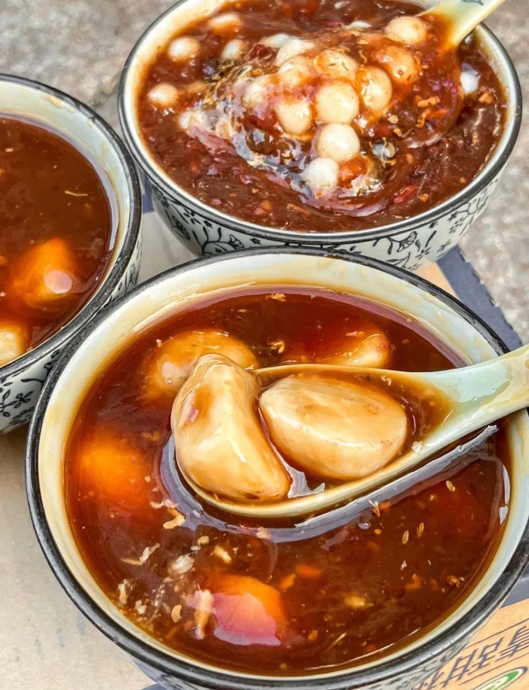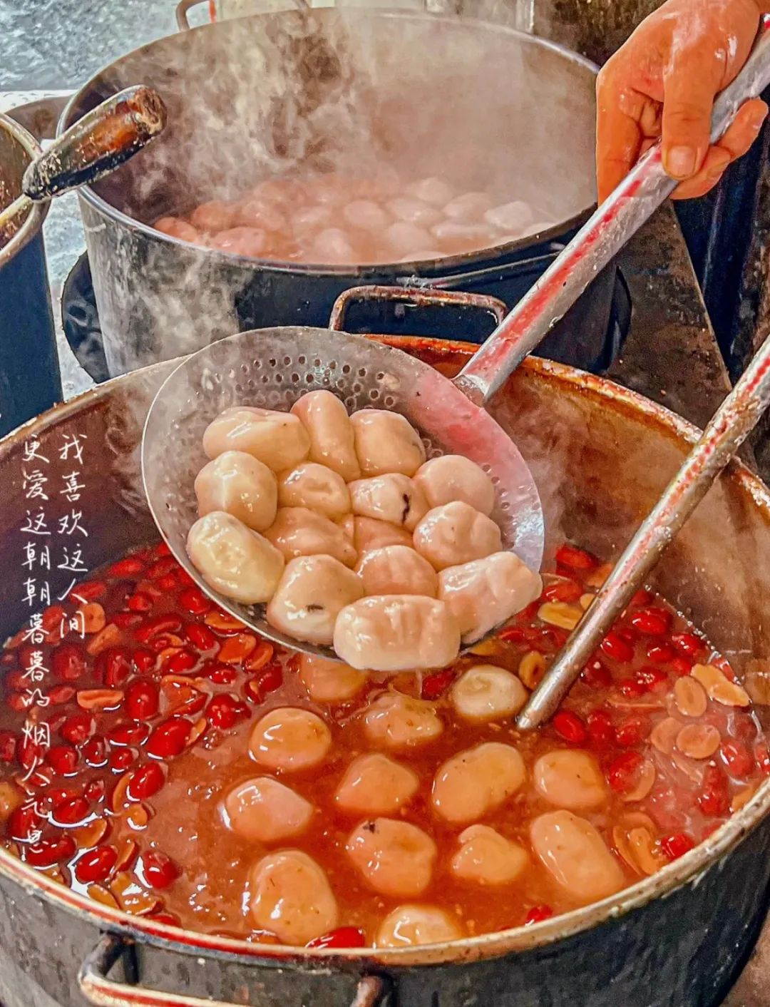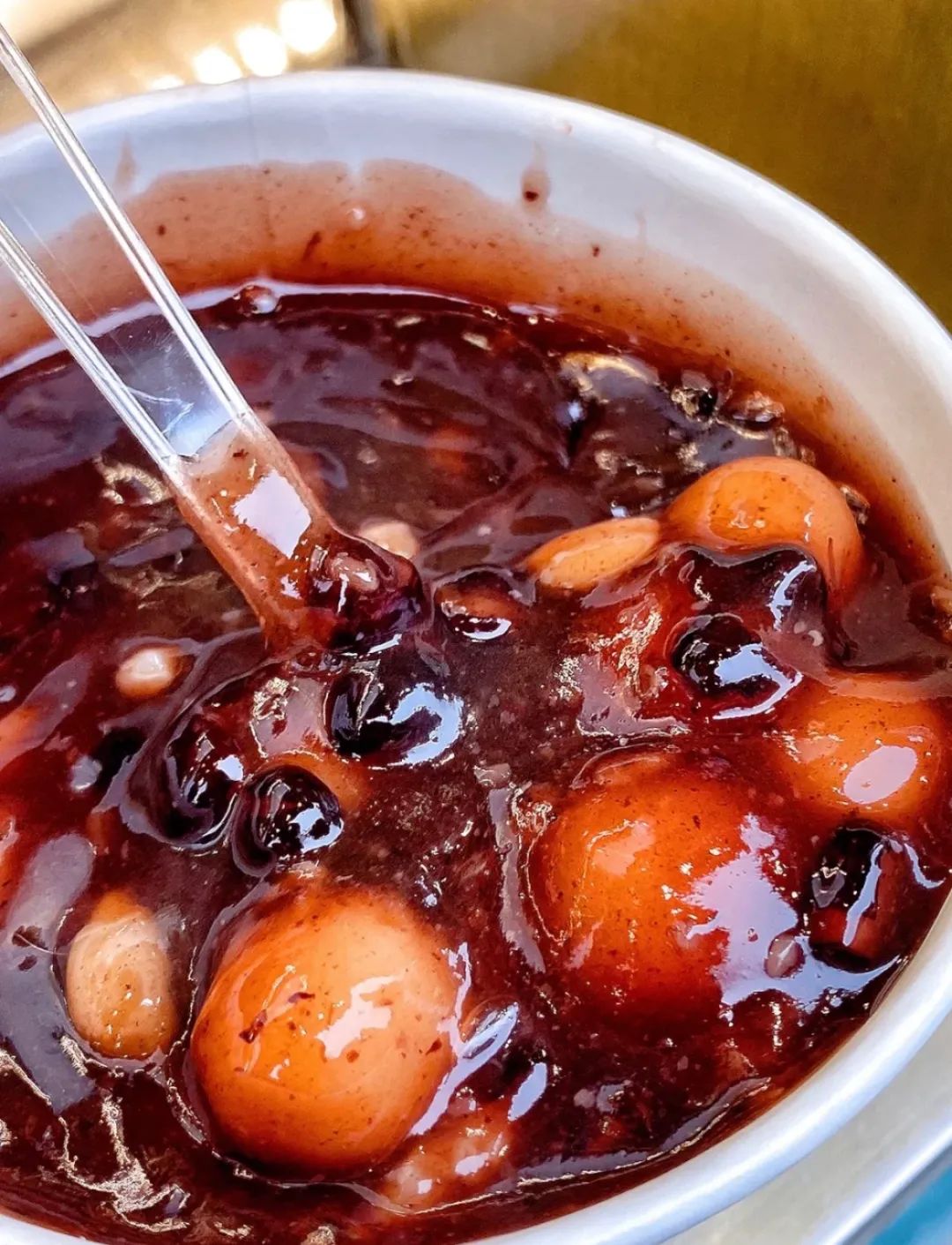 蓝老大糖粥藕店家的赤豆元宵,满口都是香甜软糯,甜蜜感倍增。