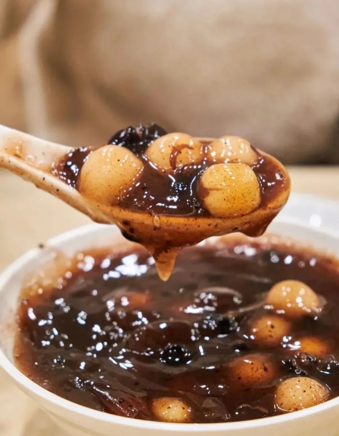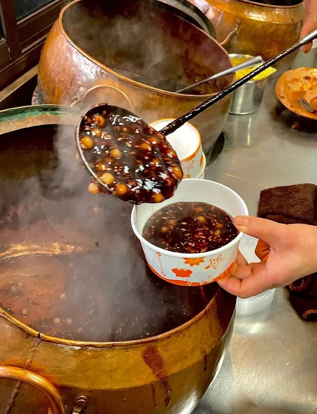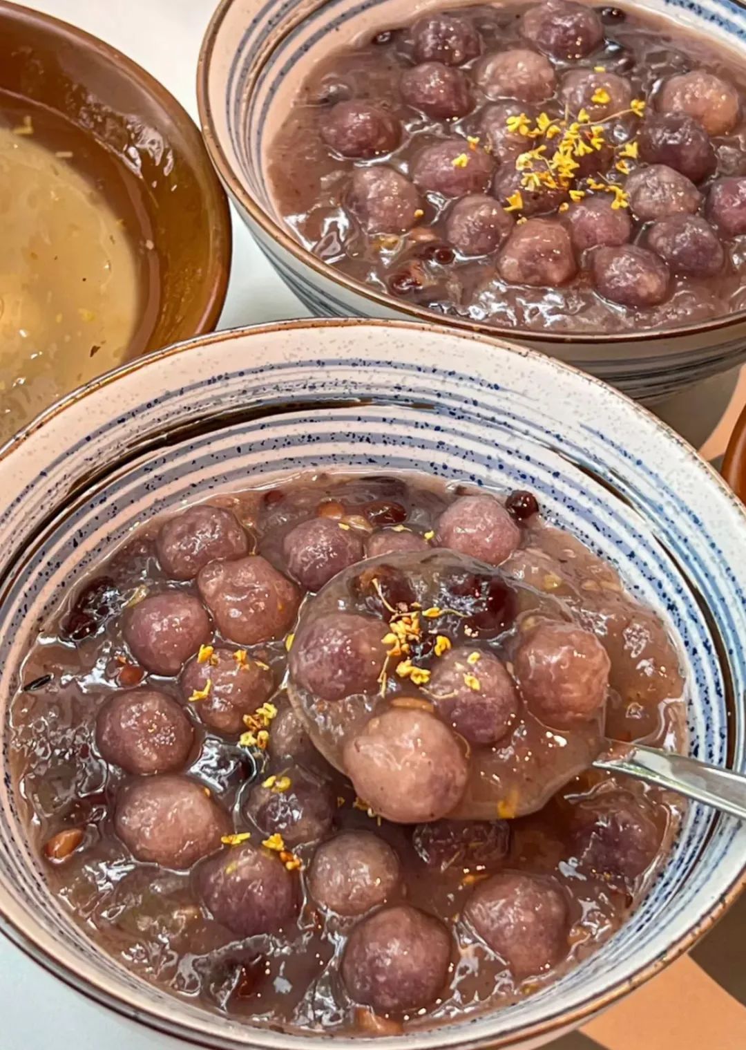 蓝老大糖粥藕店家的赤豆元宵,满口都是香甜软糯,甜蜜感倍增。