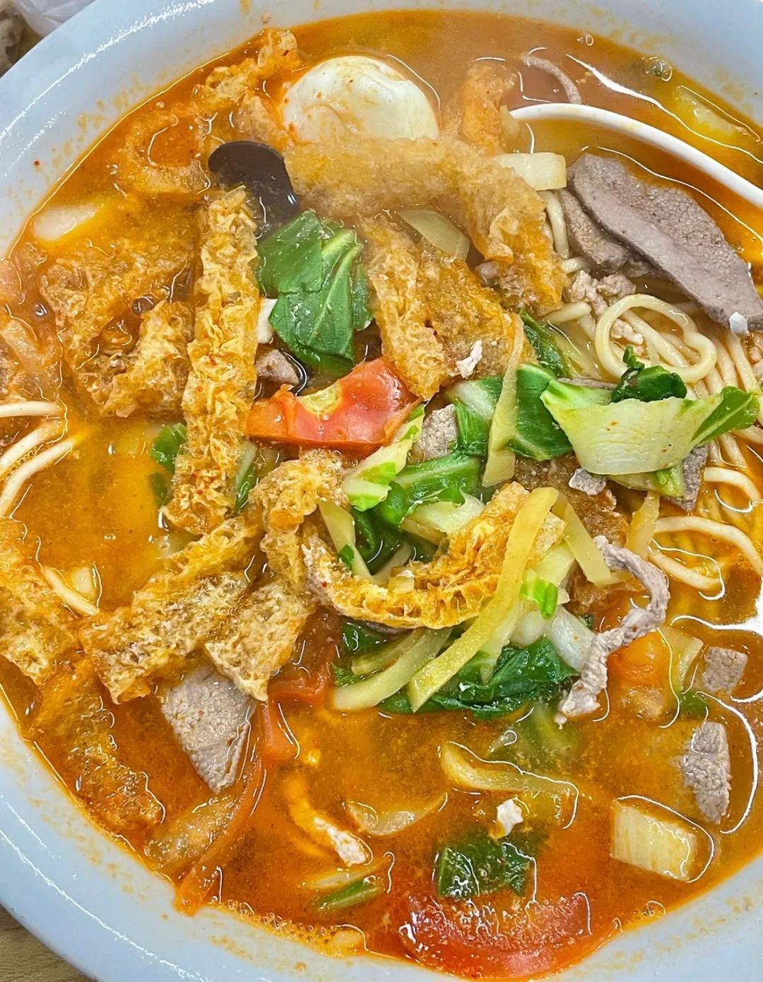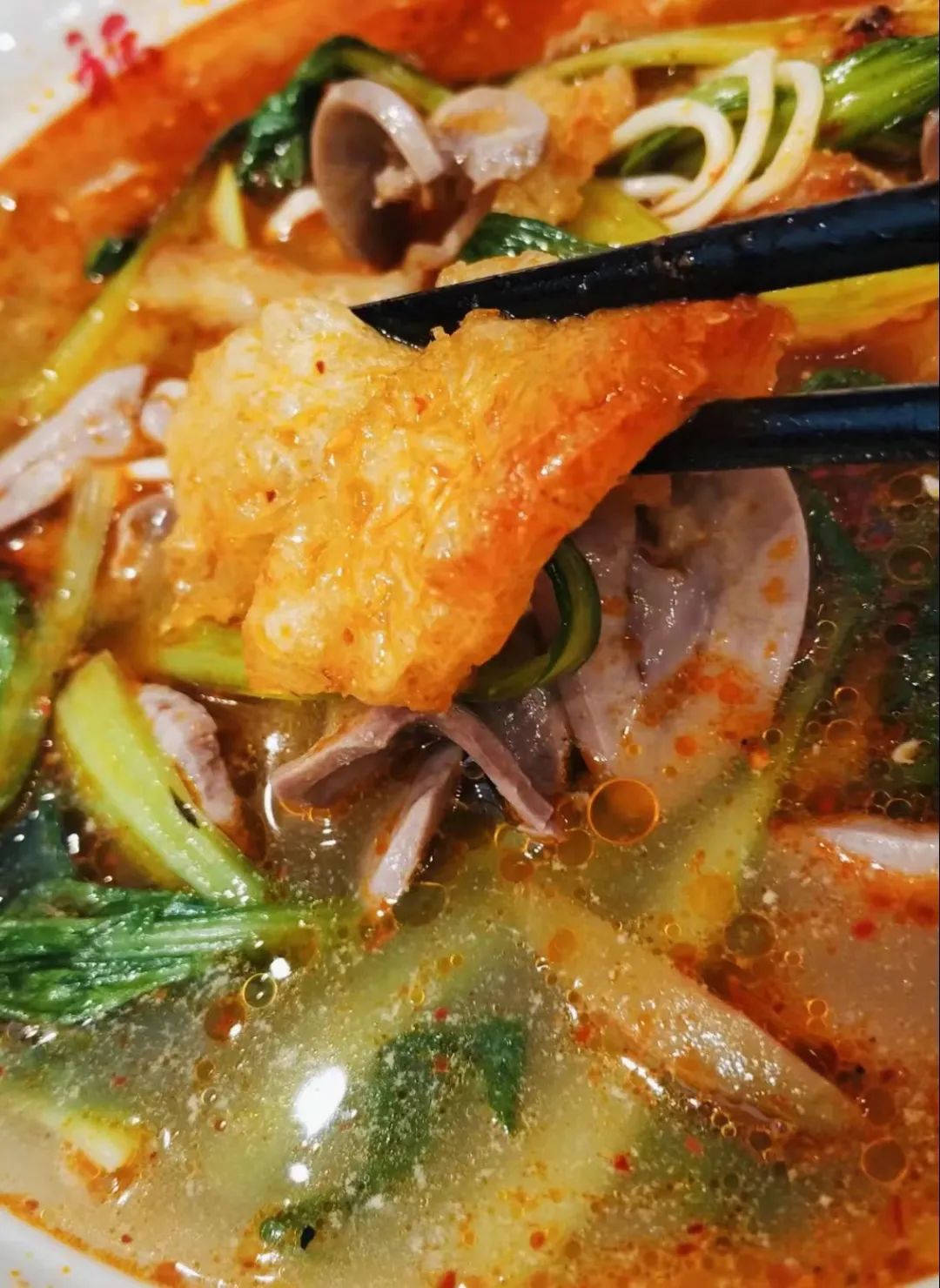 一碗全家福,配料超多,不仅有加大号的皮肚,还有番茄、酱香排骨、爽滑猪肝等,这大气程度,连南京土著都直称“爽快”。