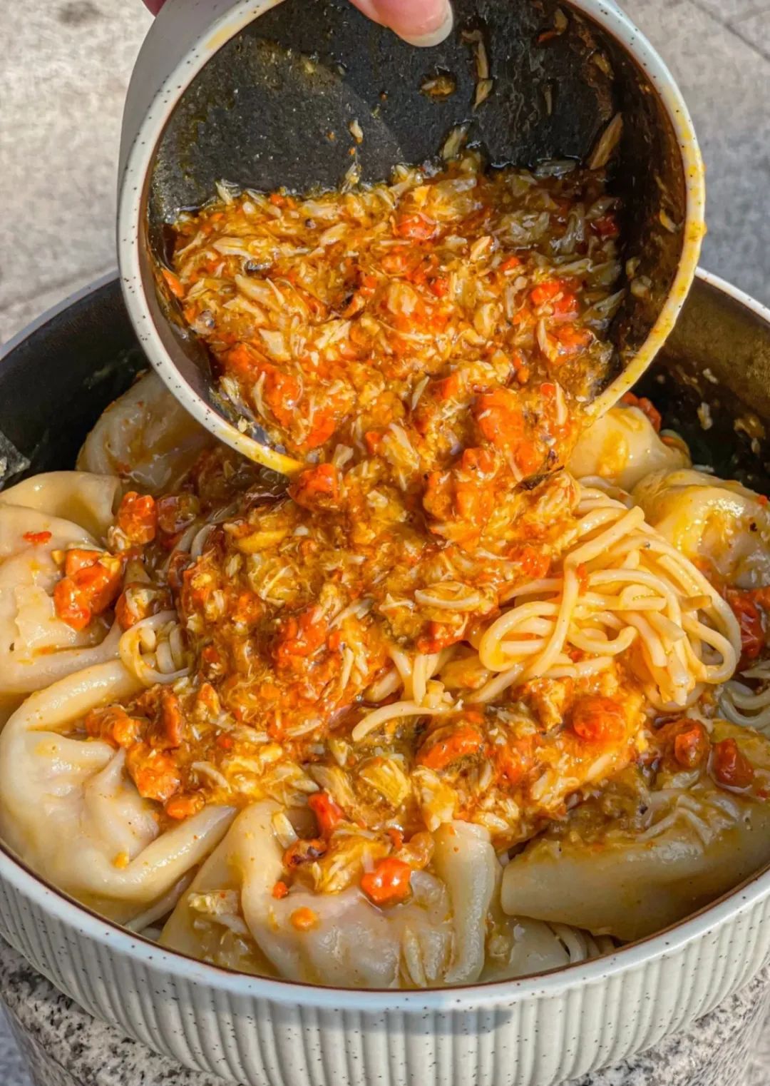 小红书 ©️哇塞南京上桌后,先热腾腾的吃上小半碗,再加入辣油和醋,搅个翻云覆雨,一口吸入,酸辣带劲。