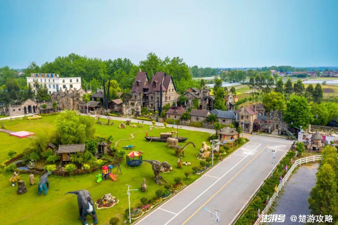 门前开阔的草坪上,错落布置有不少园林小品、恐龙雕塑、小型游乐设施和供游人休息的木亭,背后光年城堡的门楼伫立,为画面更增添了几分历史厚重感和视觉冲击力。