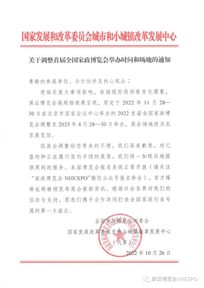 受相关重大事项影响,依据现阶段形势变化需要,保证博览会高规格效果呈现,原定于2022年11月28—30日在北京市国家会议中心举办的2022首届全国家政博览会调整至2023年4月28—30日举办,展会场地改为北京展览馆。