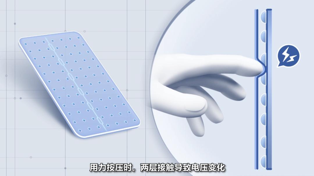 用力按压时,两层接触导致电压变化,内置感应器识别到变化,经由控制器将电压数字化并传输给处理器,运算出按压动作的位置,将其转化为屏幕操作。
