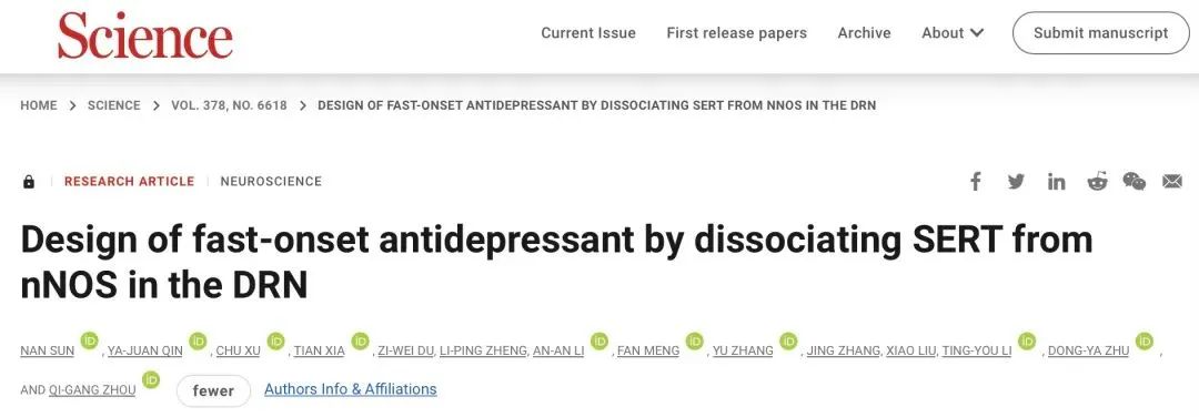 10月27日,南京医科大学生殖医学国家重点实验室、药学院周其冈、朱东亚、厉廷有团队在Science杂志在线发表题为“基于大脑中缝背核SERT-nNOS蛋白偶联靶点设计快速抗抑郁药”(Design of fast-onset antidepressant by dissociating SERT from nNOS in the DRN)的研究论文,该成果是南京医科大学具有完全自主知识产权的科研成果首次在Science期刊上发表,标志了学校科研团队在重大脑疾病药物研发的原创理论与自主创新中取得了重大突破。