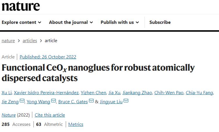 10月26日,中国科学技术大学曾杰课题组、华盛顿州立大学Yong Wang课题组、加利福尼亚大学戴维斯分校Bruce C. Gates课题组和亚利桑那州立大学刘景月课题组合作,在Nature杂志发表了题为“Functional CeOxnanoglues for robust atomically dispersed catalysts”的文章。该工作报道了一种“纳米岛”限域的原子级分散催化剂,突破了传统催化剂活性和稳定性的矛盾。在该研究中,曾杰教授为共同通讯作者。