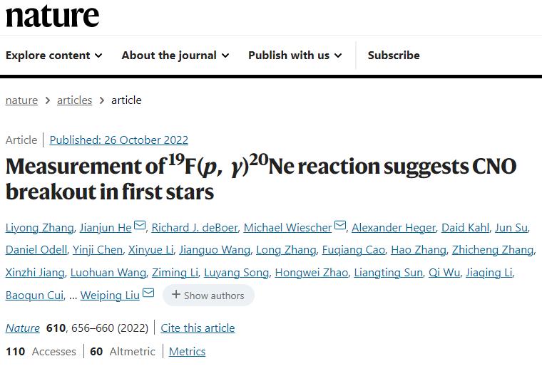 10月26日,中国原子能科学研究院柳卫平、北京师范大学何建军与美国圣母大学Michael Wiescher合作在Nature杂志在线发表题为“Measurement of 19F(p, γ)20 Ne reaction suggests CNO breakout in first stars”的研究论文。北京师范大学核科学与技术学院张立勇副教授为论文第一作者,何建军教授为第一通讯作者。北京师范大学核科学与技术学院为论文的第一单位。该工作得到了国家基金委杰出青年基金以及重大项目等的资助。