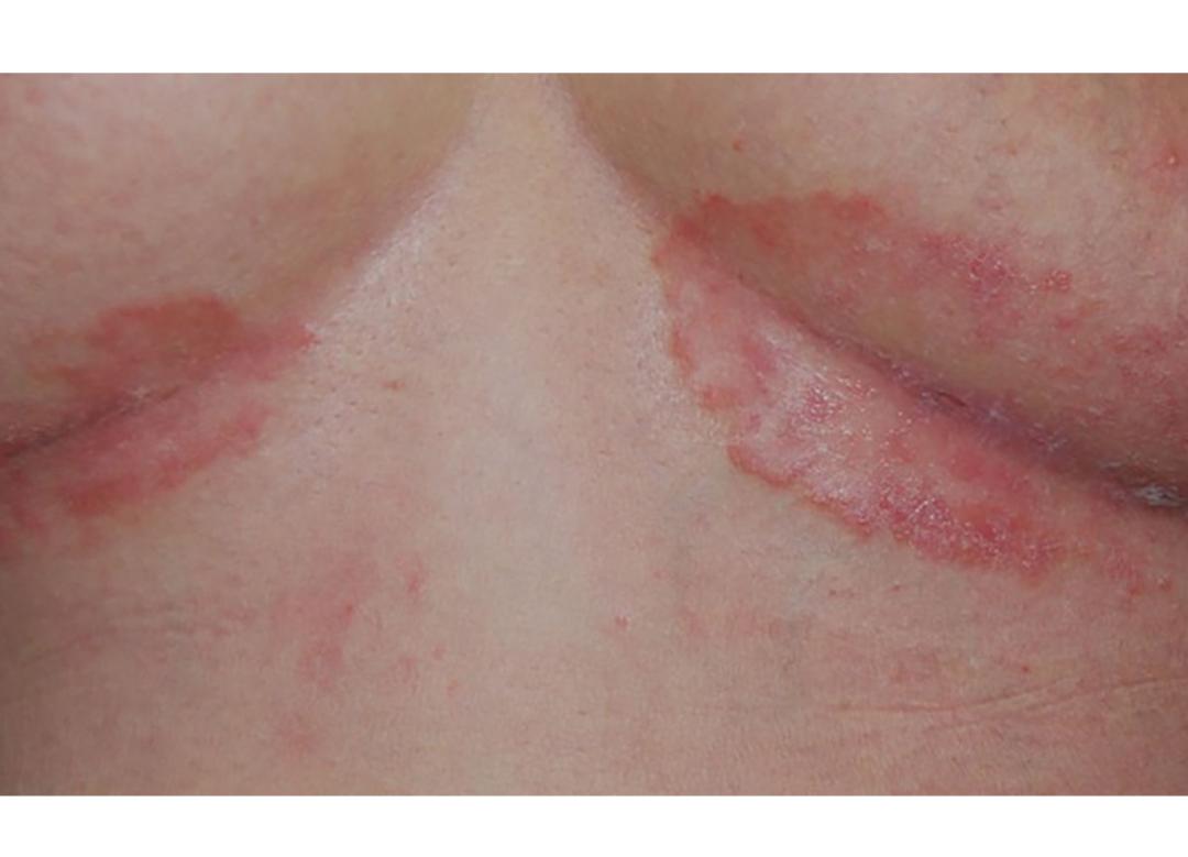 银屑病虽然在四肢伸侧最为常见,但是身体屈侧皱褶部位也是可以出现的,比如面部、腋窝、女性乳房下、腹股沟等薄嫩部位,可能会和间擦性皮炎、股癣混淆,但是反转型银屑病看上去更为清楚,且皮疹的痒感不太明显,相较于寻常斑块型的鳞屑不多。