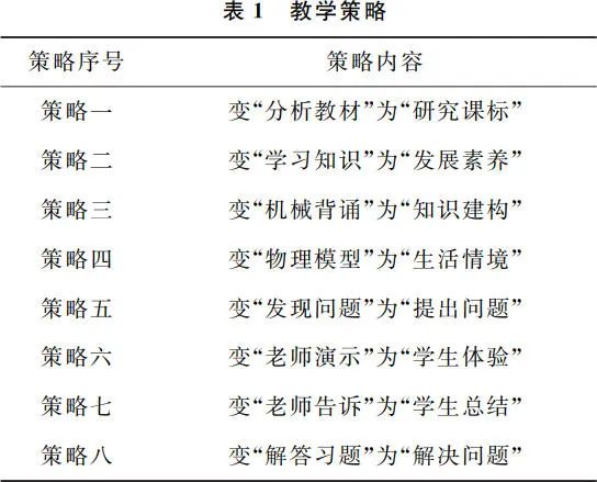 策略是指在不同的教学条件下,为达到不同的教学结果所采用的方式、方法、媒体的总和。教学策略是指在教学过程中,为了完成教学目标,依据教学的主客观条件,特别是学生实际情况,对所用的教学顺序、活动程序、组织形式、教学方法和教学媒体等的总体考虑。通俗地说,教学策略就是教学各个环节遵循的思想和方法。笔者任教高中物理 20 多年,比较了解一线物理教师的备课习惯、教学理念、教学方法等。针对高中物理教师存在的不足,笔者提出八个教学策略(如表 1 所示),可以有效地培育学生物理学科核心素养,并以“静电的防止与利用”为例[2,3]进行具体说明。