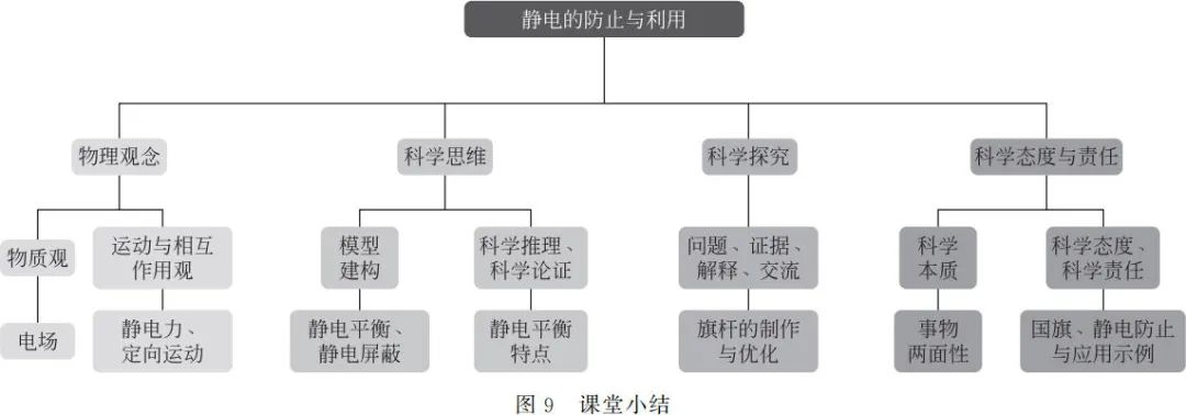 步骤五、课堂小结课堂小结就是对本节课进行梳理与提炼。教师引导学生从物理学科核心素养四个方面进行小结(如图 9),从而促进学生物理学科核心素养全面发展。在微观上,回顾物理知识,建构知识结构,有利于增强知识的灵活应用。在宏观上,把物理学上升到哲学高度:任何事物都有两面性,我们要根据其特点,既防止也利用。