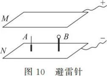 1.如图 10 所示是模拟避雷针作用的实验装置,金属板 M、N 间有两个等高的金属体 A、B,A 为尖头、B 为圆头。将金属板 M、N 接在高压电源上,逐渐升高电源电压,首先观察到( )。