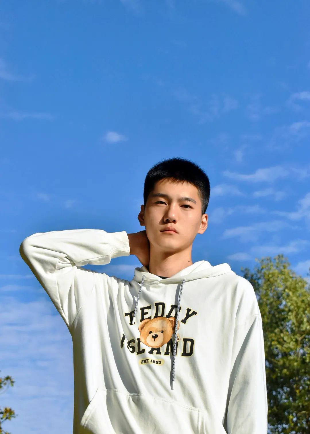 白色泰迪熊卫衣与淡蓝牛仔裤