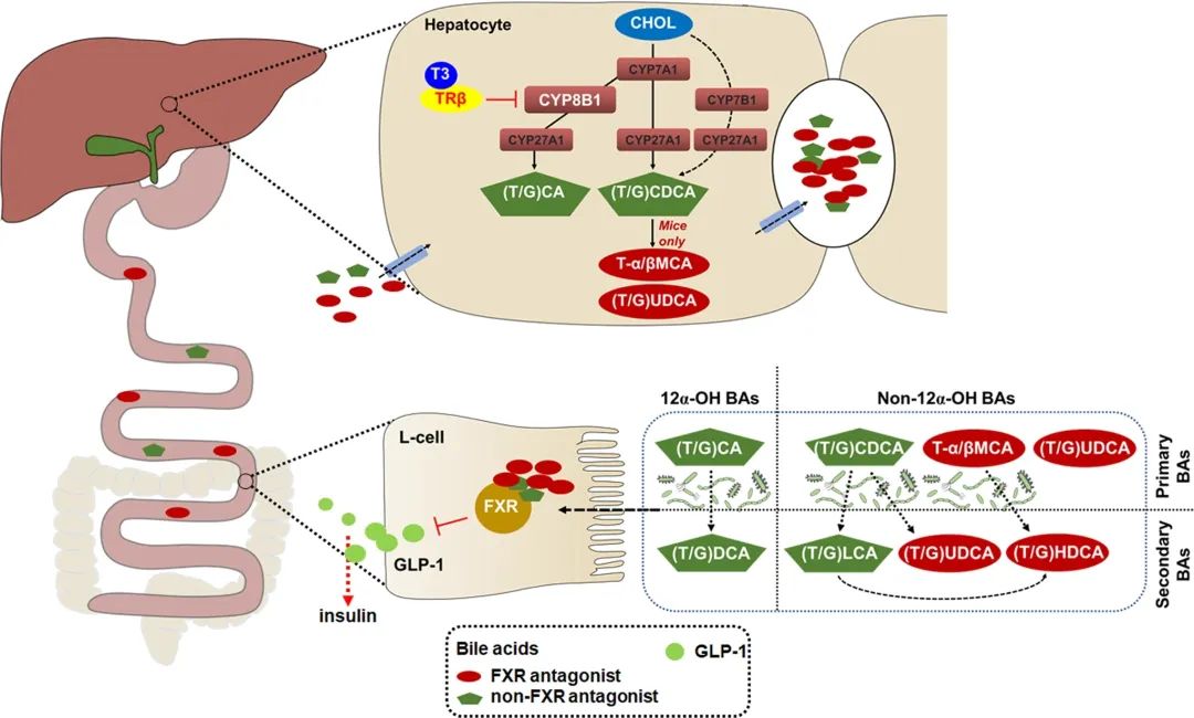 该研究发现,甲状腺激素能够通过GLP-1与血糖稳态建立联系。激活肝脏甲状腺激素信号通路具有促胰岛素分泌和降低血糖的作用,作用方式为通过抑制CYP8B1的表达而改变胆汁酸的组成,增加了具有FXR拮抗作用的non-12α-羟基胆汁酸的水平,从而通过抑制肠道FXR信号通路来增加GLP-1的产生,揭示了以肝脏为靶点的TRβ激动剂在未来具有治疗2型糖尿病的可行性。