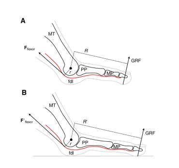 我们脚趾的模型示意图,B图是长脚趾的情况。|参考资料[5]因此,按照杠杆原理,脚趾越长,需要的力就越大。而且还会更容易损伤。