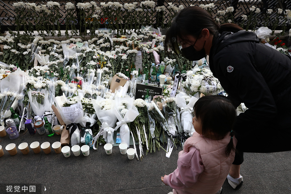 韩国进入了全国哀悼期,总统尹锡悦和夫人金建希10月31日前往设于首尔广场首尔图书馆正门前的集体焚香所,为遇难者献花并默哀,途中一言未发。在当天的政府联合简报会上,记者提问“政府对无主办方的聚会是否有应对指南?”“警方是否做好了人流管控的准备?”政府和警方发言人的回答模糊不清。