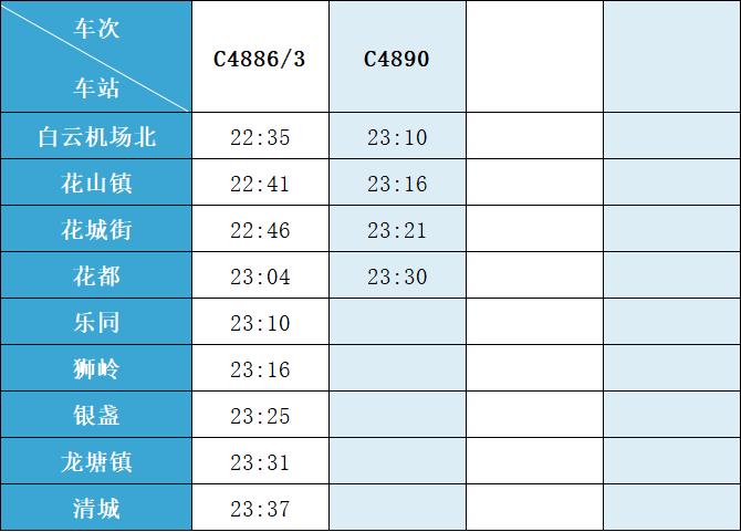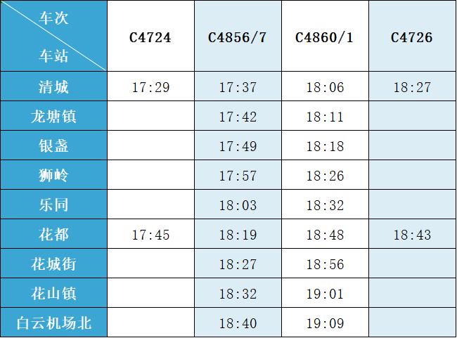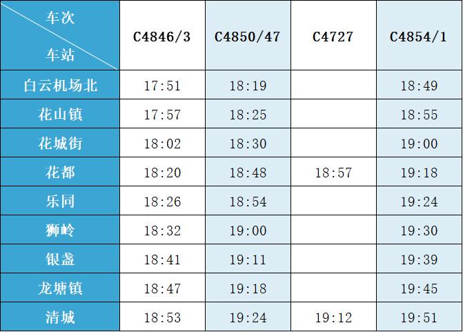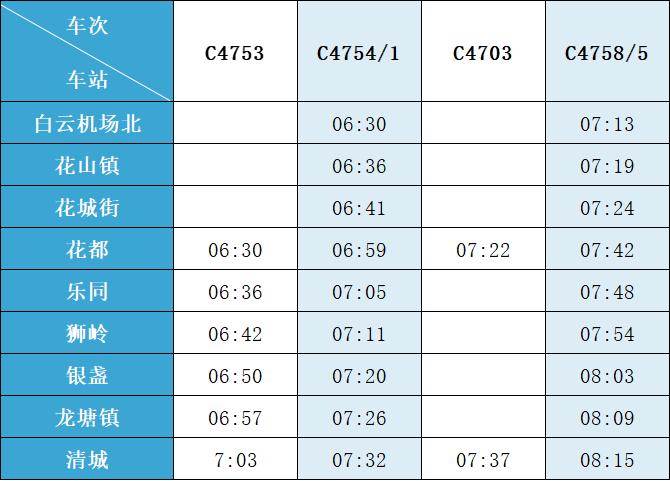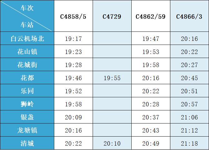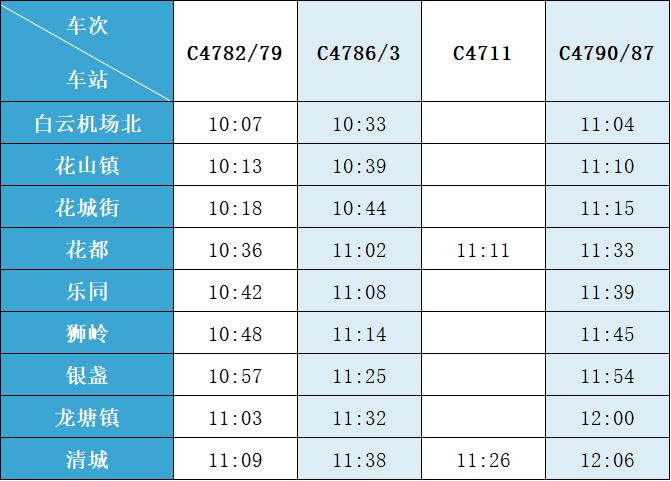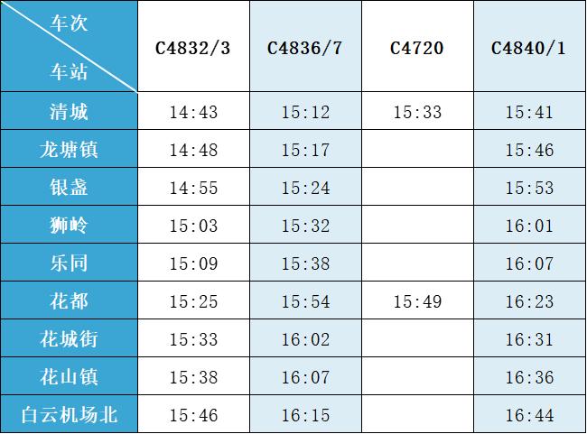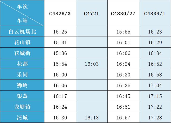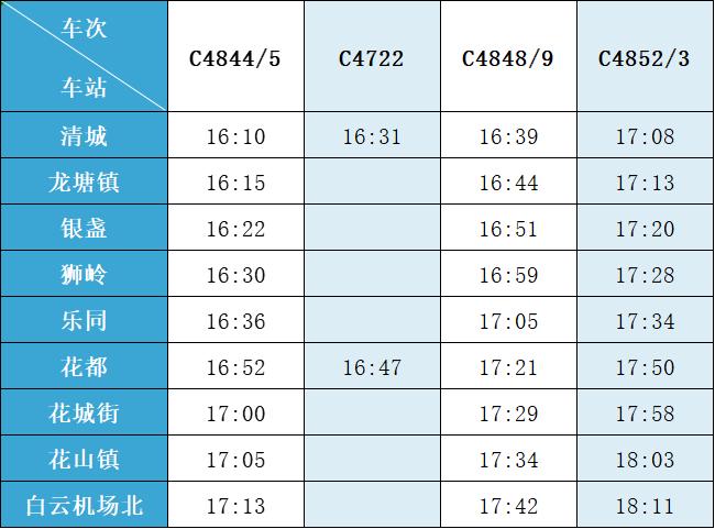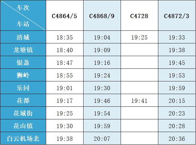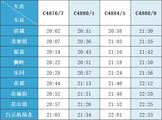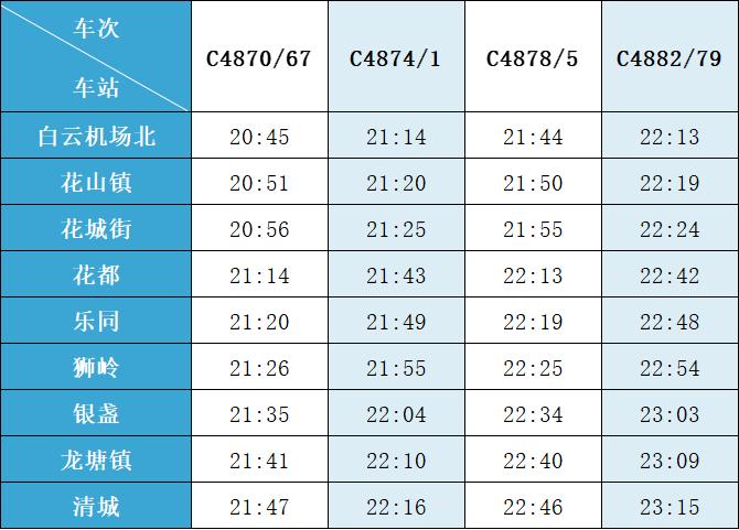 (注:各站首末班车时间均未调整,清城站首班车 6:15,白云机场北站首班车6:30;清城站末班车 21:30,白云机场北站往清城方向末班车 22:35、往花都方向末班车 23:10。)列车的实际到站时间