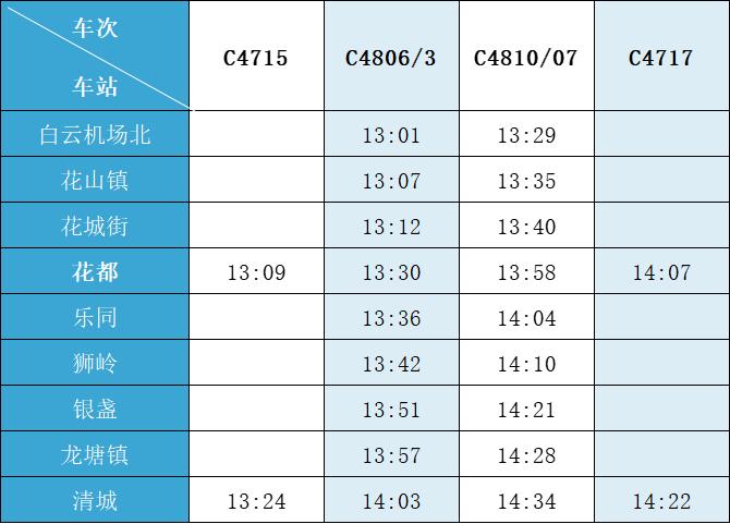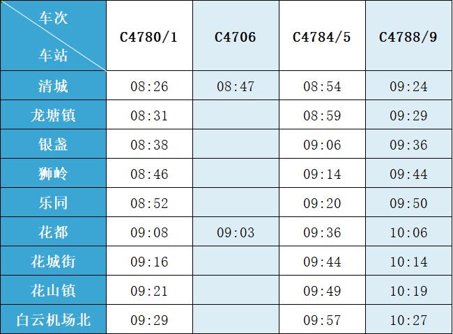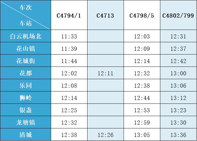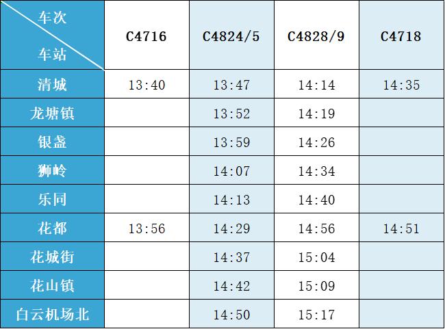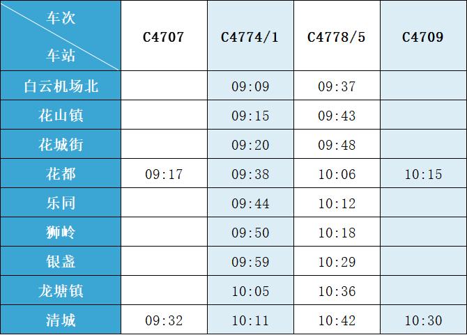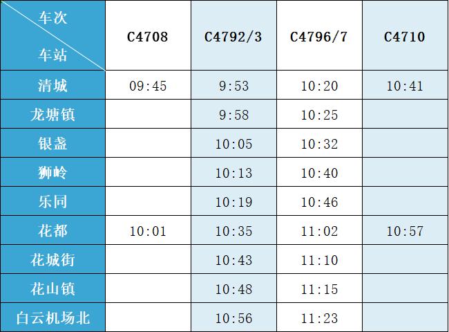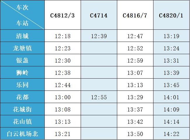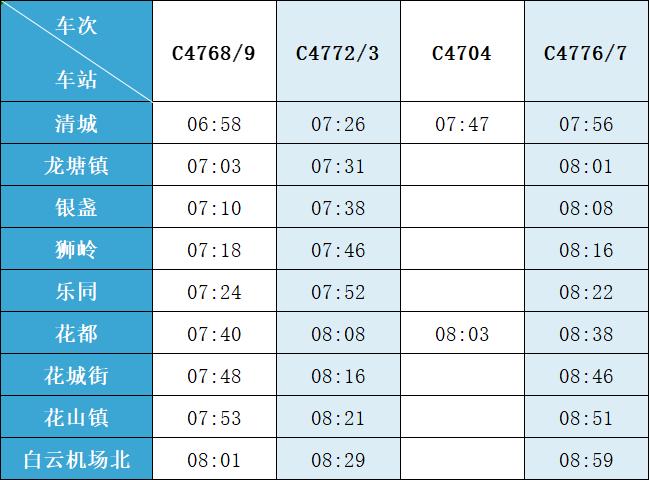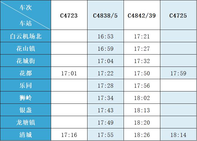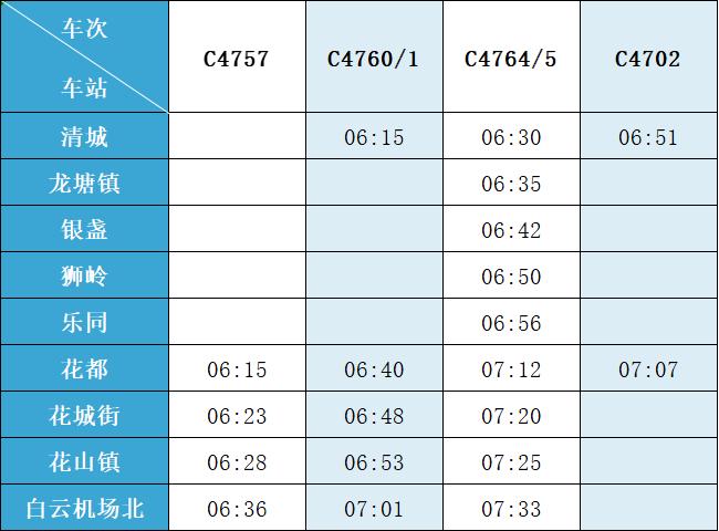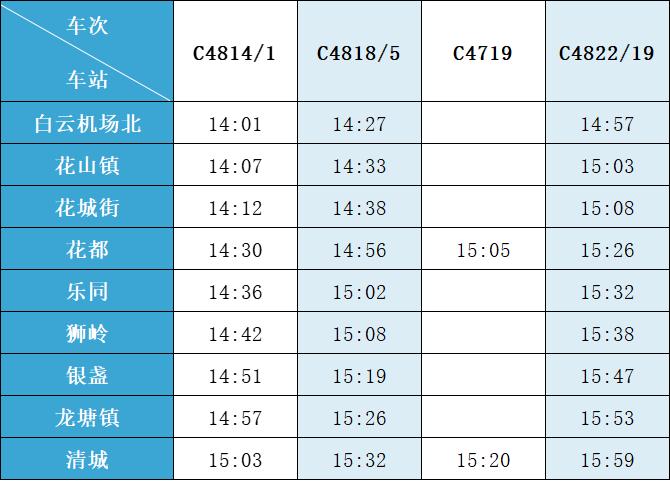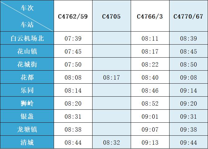 (注:各站首末班车时间均未调整,清城站首班车 6:15,白云机场北站首班车6:30;清城站末班车 21:30,白云机场北站往清城方向末班车 22:35、往花都方向末班车 23:10。)列车的实际到站时间