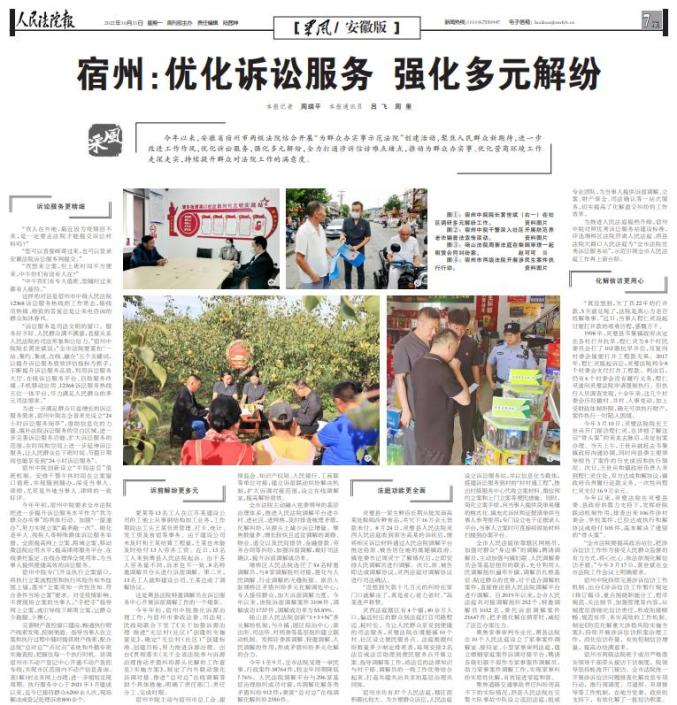 宿州:优化诉讼服务 强化多元解纷今年以来,安徽省宿州市两级法院结合开展“为群众办实事示范法院”创建活动,聚焦人民群众新期待,进一步改进工作作风,优化诉讼服务,强化多元解纷,全力打通涉诉信访难点堵点,推动为群众办实事、优化营商环境工作走深走实,持续提升群众对法院工作的满意度。