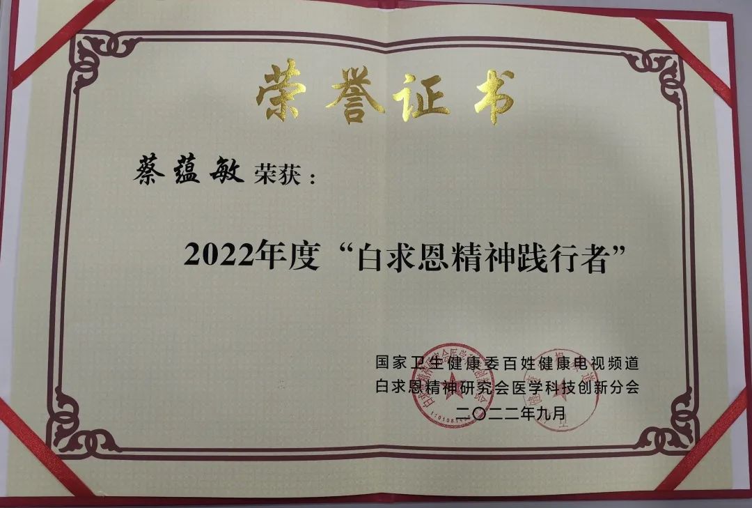 由国家卫生健康委百姓健康电视频道、白求恩精神研究会医学科技创新分会联合举办的2022年度寻访“白求恩精神践行者”公益活动,历经6个月的寻访推荐,最终全国共有112名卫生健康工作者列为“白求恩精神践行者”荣誉获得者。我院心血管内科主任龚辉、创面诊疗中心主任蔡蕴敏、神经外科副主任颜玉峰位列其中。“
