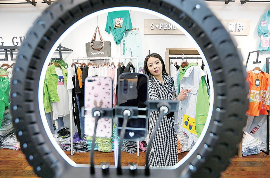 ■即墨服装批发市场,根禾服饰销售员在直播销售。