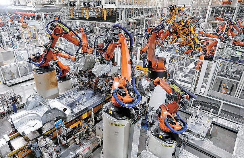 ■汽车产业新城一汽—大众汽车有限公司青岛分公司,智能机械手在焊接车身底板。