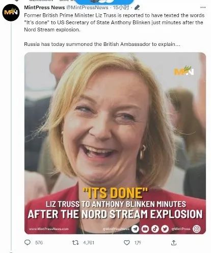 近期,推特有消息称,英国前首相特拉斯曾在9月26日“北溪”管道爆炸后立刻向美国国务卿布林肯发短信表示“搞定了”。
