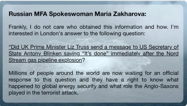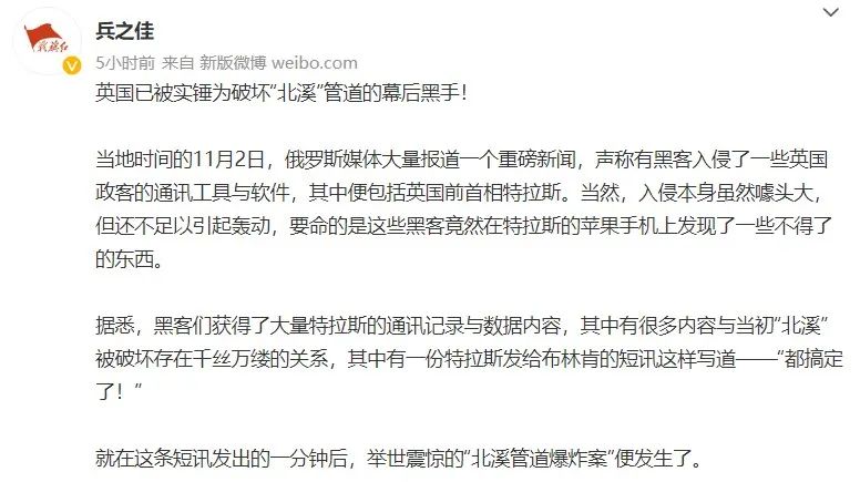 微博也有网友发布类似消息称,“英国已被实锤为‘北溪’管道爆炸的幕后黑手!根据俄媒报道,俄罗斯黑客入侵了特拉斯的通讯工具并获得其中的数据内容,其中有一份特拉斯发给布林肯的短讯写道‘都搞定了’,短讯发出后‘北溪’管道就爆炸了。”
