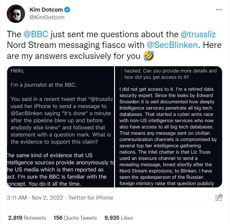 在谷歌检索相关说法,可以发现多家媒体均引用了同一个推特用户Kim Dotcom10月30日的推文。Kim Dotcom称,“俄罗斯人是怎么知道英国与美国合作炸毁了‘北溪’管道呢?因为在管道爆炸后一分钟特拉斯就用她的手机给布林肯发消息说‘搞定了’。”这也是网传说法最早的出处。