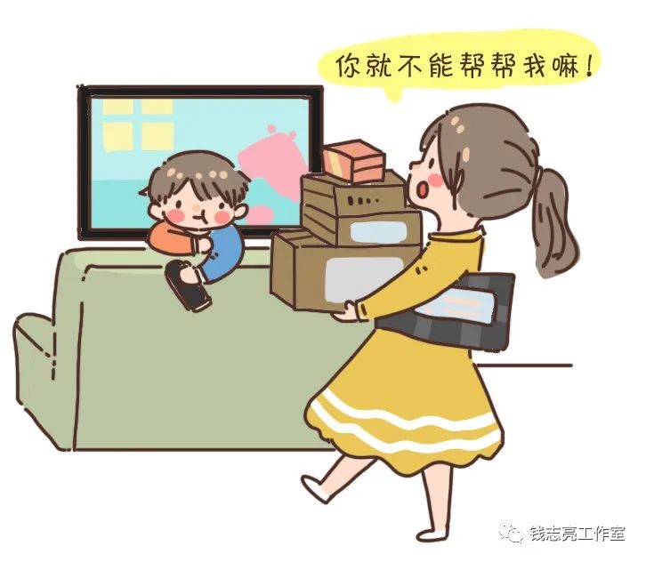 有一天爸爸在网上买了东西寄到家里,快递很重,他们家住5楼,又没电梯,妈妈喊孩子帮忙,孩子嘴上说着:“知道了!”,却半天不离开电脑边。