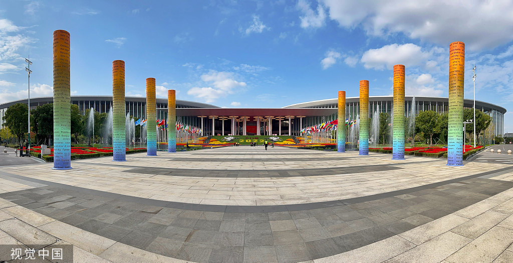 2022年11月4日,上海,国家会展中心南广场鲜花盛开,各国国旗飘扬,八根立柱上有各国语言的“你好”,喜迎第五届中国国际进口博览会开幕。视觉中国 图