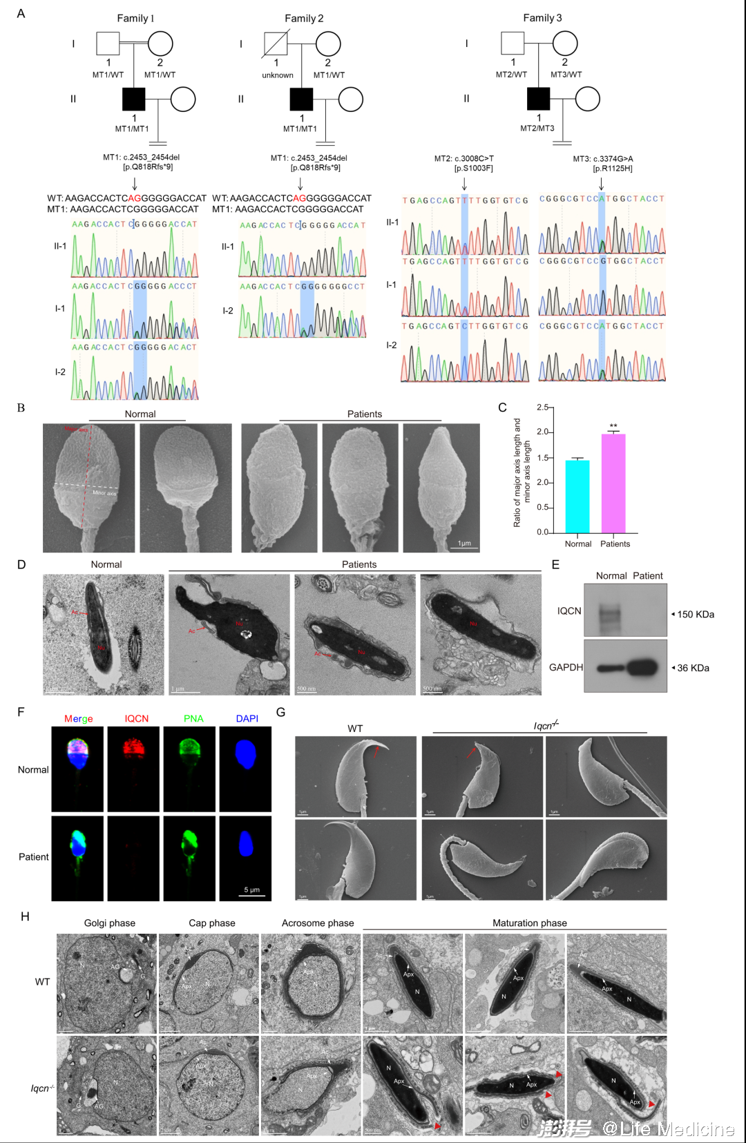 Yanwei Sha, Yongjie Chen, Xiong Wang, Ranran Meng, Xiaoyan Yang, Youzhu Li, Pengpeng Jin, Shanze Li, Jie Chen, Tianyu Shao, Dan Xu, Yibiao Guo, Zhaodi Jiang, Yuhua Li, Shuntai Yu, Lin Li, Fengchao Wang, Biallelic mutations in IQCN, encoding a novel acroplaxome protein, lead to fertilization failure and male infertility with defects in the acrosome and shaping of the spermatid head in humans and mice, Life Medicine, 2022;, lnac050, https://doi.org/10.1093/lifemedi/lnac050