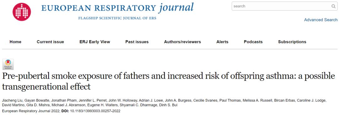 [6] Liu J, Bowatte G, Pham J, et al. Pre-pubertal smoke exposure of fathers and increased risk of offspring asthma: a possible transgenerational effect [published online ahead of print, 2022 Sep 14]. Eur Respir J. 2022;2200257. doi:10.1183/13993003.00257-2022