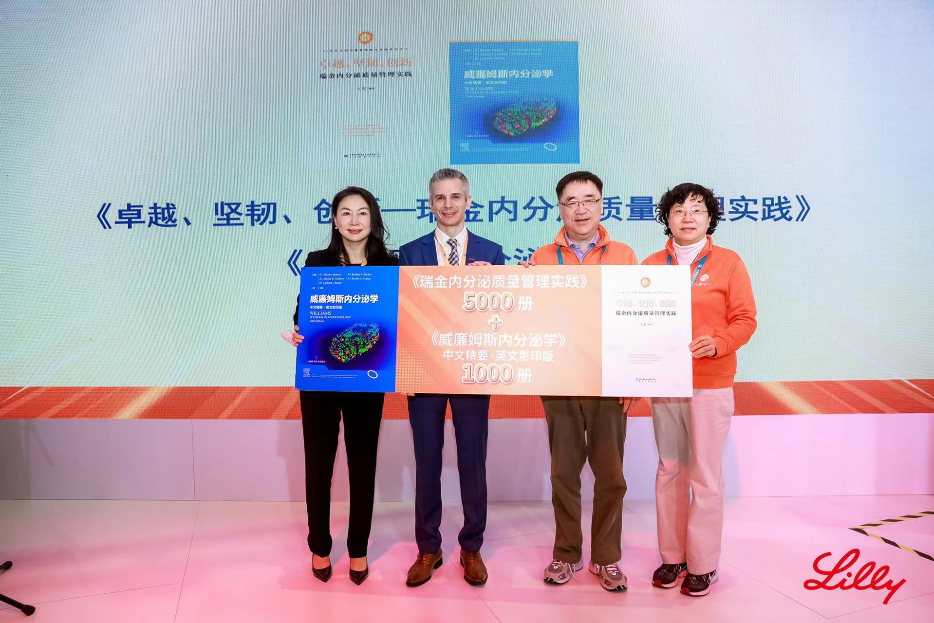 11月6日,在第五届中国国际进口博览会上,上海交通大学医学院附属瑞金医院、国家代谢性疾病临床医学研究中心、国家标准化代谢性疾病管理中心(以下简称MMC)携手参展企业礼来、阿斯利康、诺和诺德,向上海交通大学医学院、广州中山大学、浙江大学医学院和华中科技大学同济医学院提供经典内分泌学书籍《威廉姆斯内分泌学中文精要+原版影印》以及中国首部内分泌代谢病专科医疗质量管理著作《卓越、坚韧、创新——瑞金内分泌质量管理实践》,用于其教育,或用于对患者进行有关疾病及其治疗教育,同时也将中外先进管理与学科经验分享至全国医院,助力中国内分泌代谢性疾病诊治的高质量快速发展。