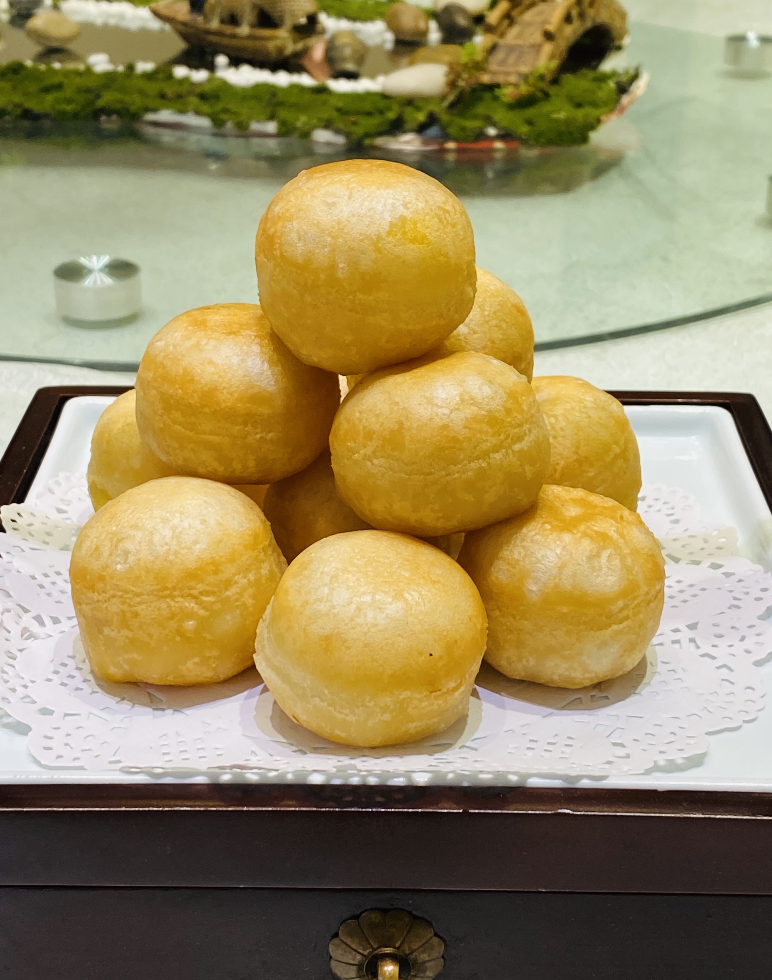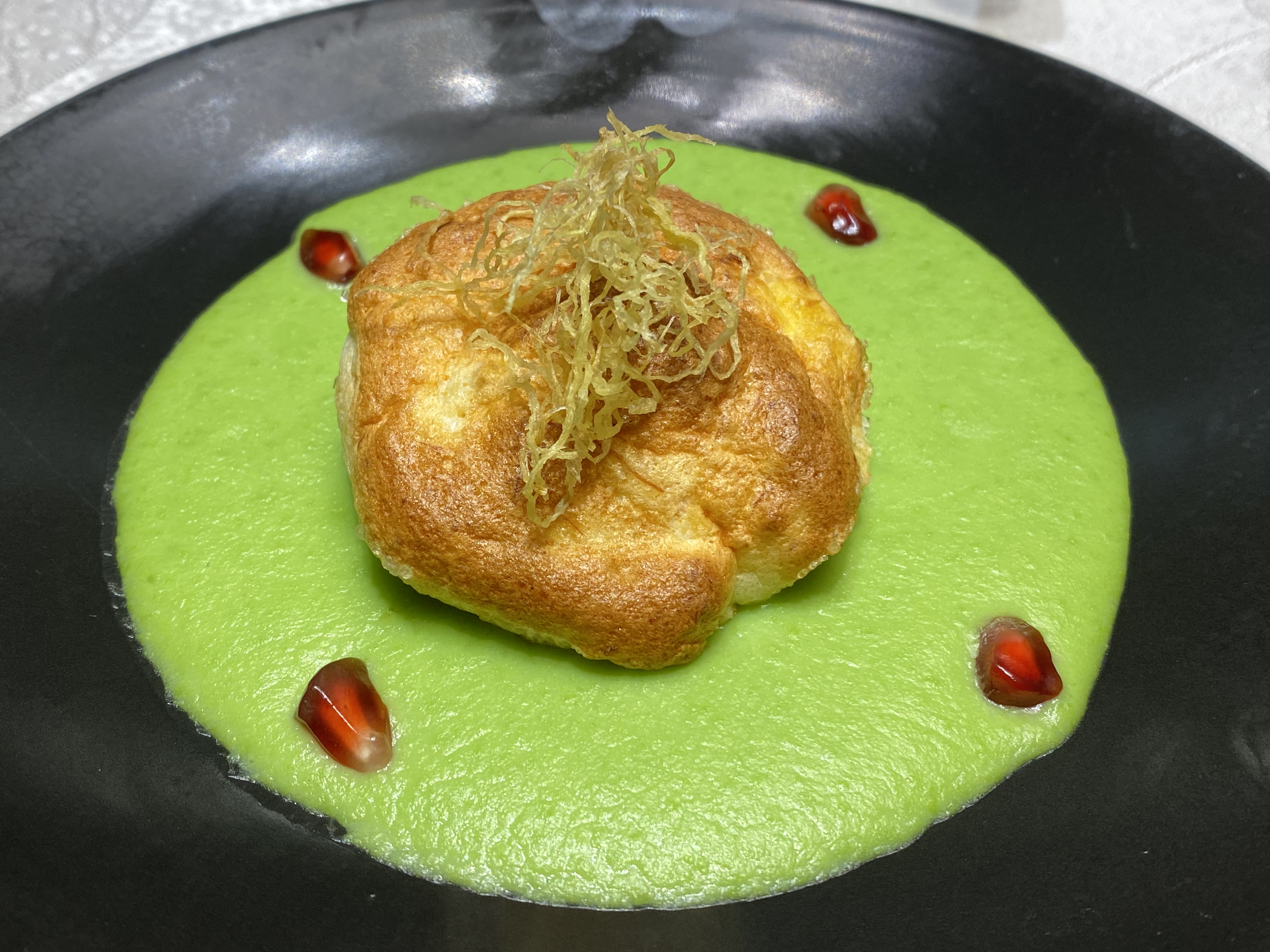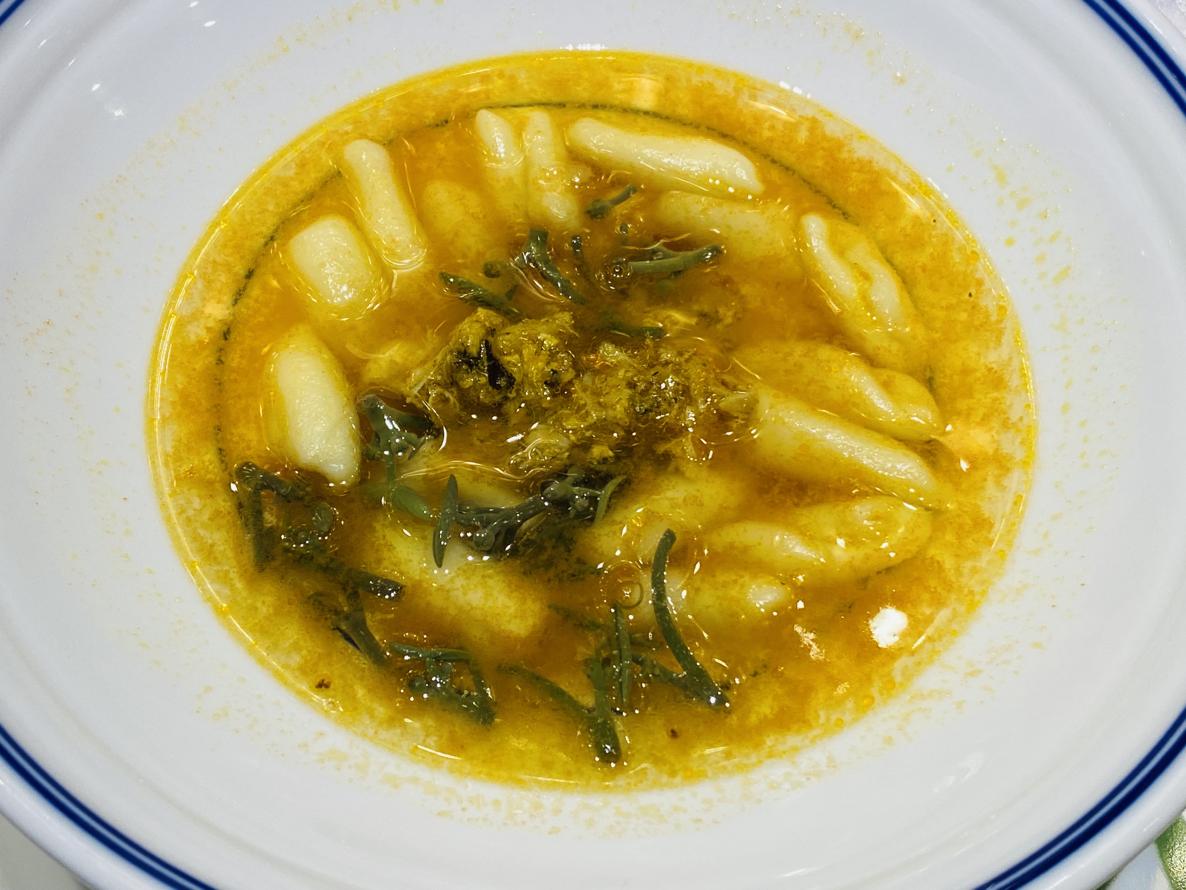 点心两道:酸汤蟹肉猫耳朵、脆皮蟹肉玉兰饼。酸汤也是用蟹壳吊的汤,酸味来自番茄的发酵,这是一道十分开胃的点心。玉兰饼看上去与黎里油墩相仿,糯米粉制作,平底锅里油炸,里面嵌了蟹粉馅心,平时也可嵌猪肉馅或豆沙馅。