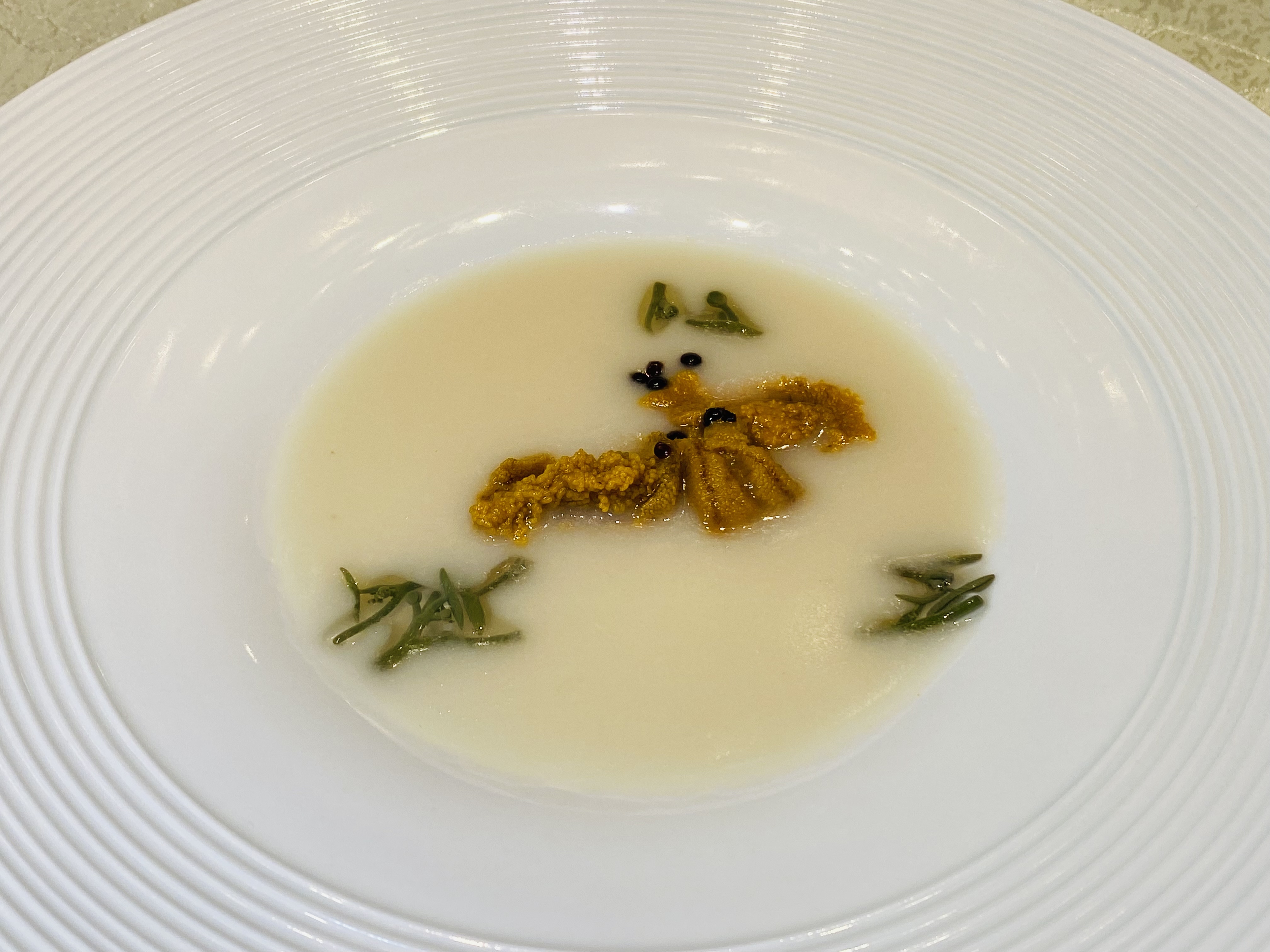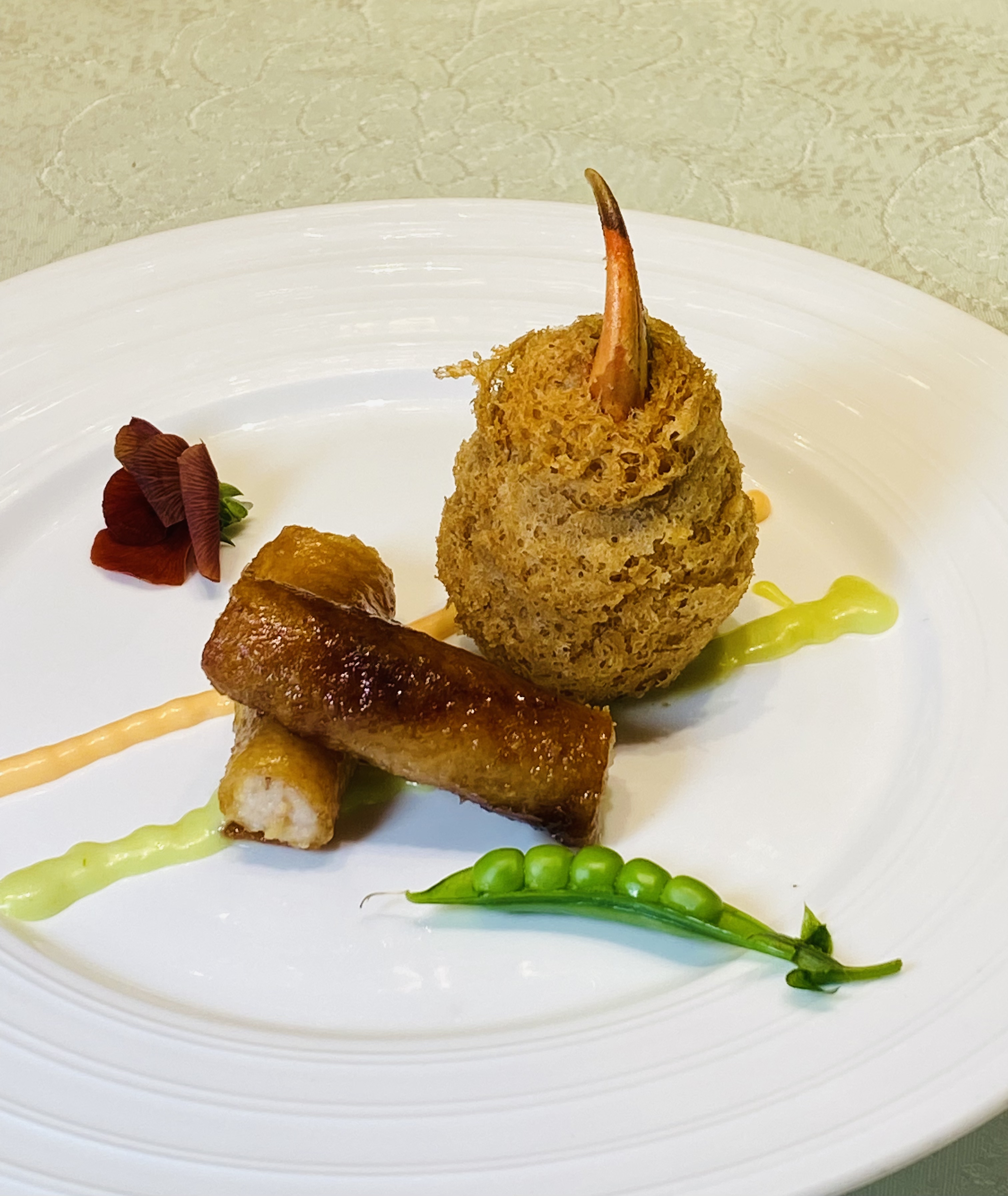 热菜有五道:蟹黄汁秃黄油鱼翅、蟹粉凤尾大明虾、蟹粥海胆鲜莼菜、荔芋茸蟹螯配松籽鸭颈、酥姜珊瑚甜豆百合。其中的蟹粥不见一颗米粒,因为是用纯肉粉碎后加蟹壳汤熬煮而成的,起锅前加了太湖莼菜嫩茎,噙了露珠般的胶质粘液,口感奇特。松籽鸭头颈其实是意会,用鸭的背皮炸脆,切成长条,再镶虾茸,看上去像头颈。