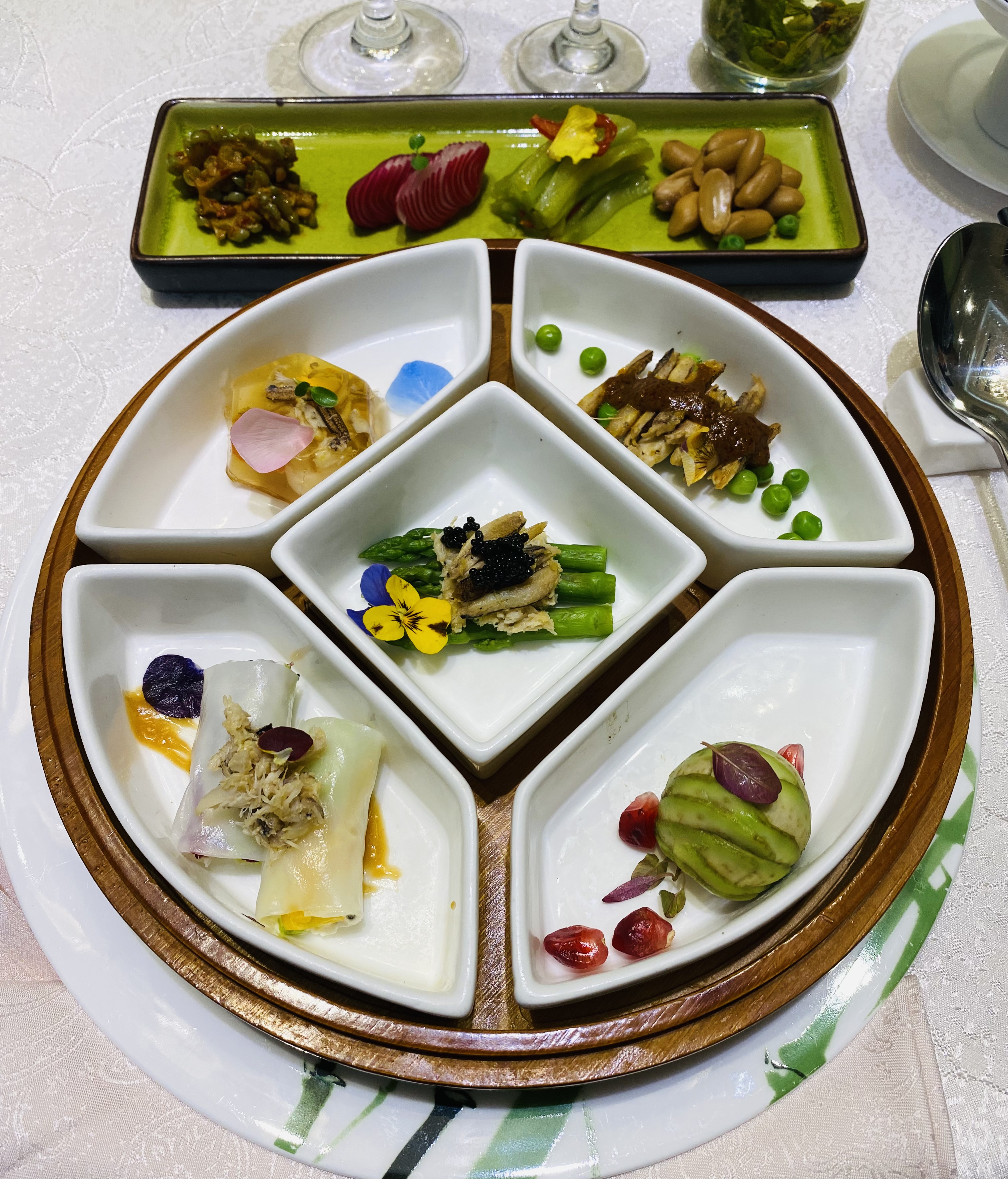 接下来才是正式冷菜,位上五宫格盘:水晶熟醉虾蟹、麻辣蟹柳、牛油果蟹肉球、米纸蟹肉蔬菜卷(底铺越南柔滑型花生酱)、黑鱼籽酱蟹肉鲜芦笋沙律。