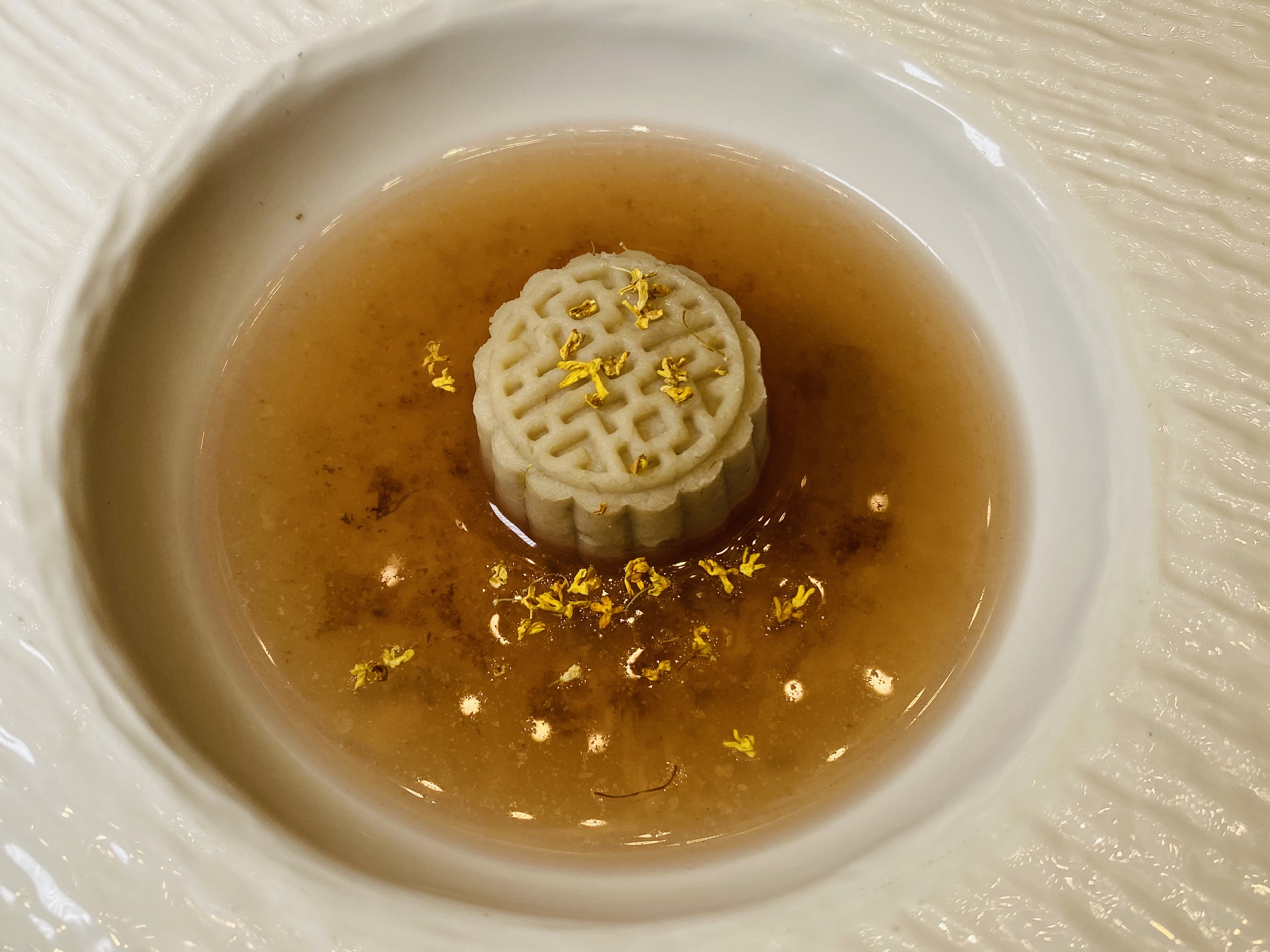 最后一道甜品收口:燕窝芡实印糕,山药打泥做成圆形苏州印糕,内嵌熟的鸡头米,浸在银耳胖大海的燕窝汤里。