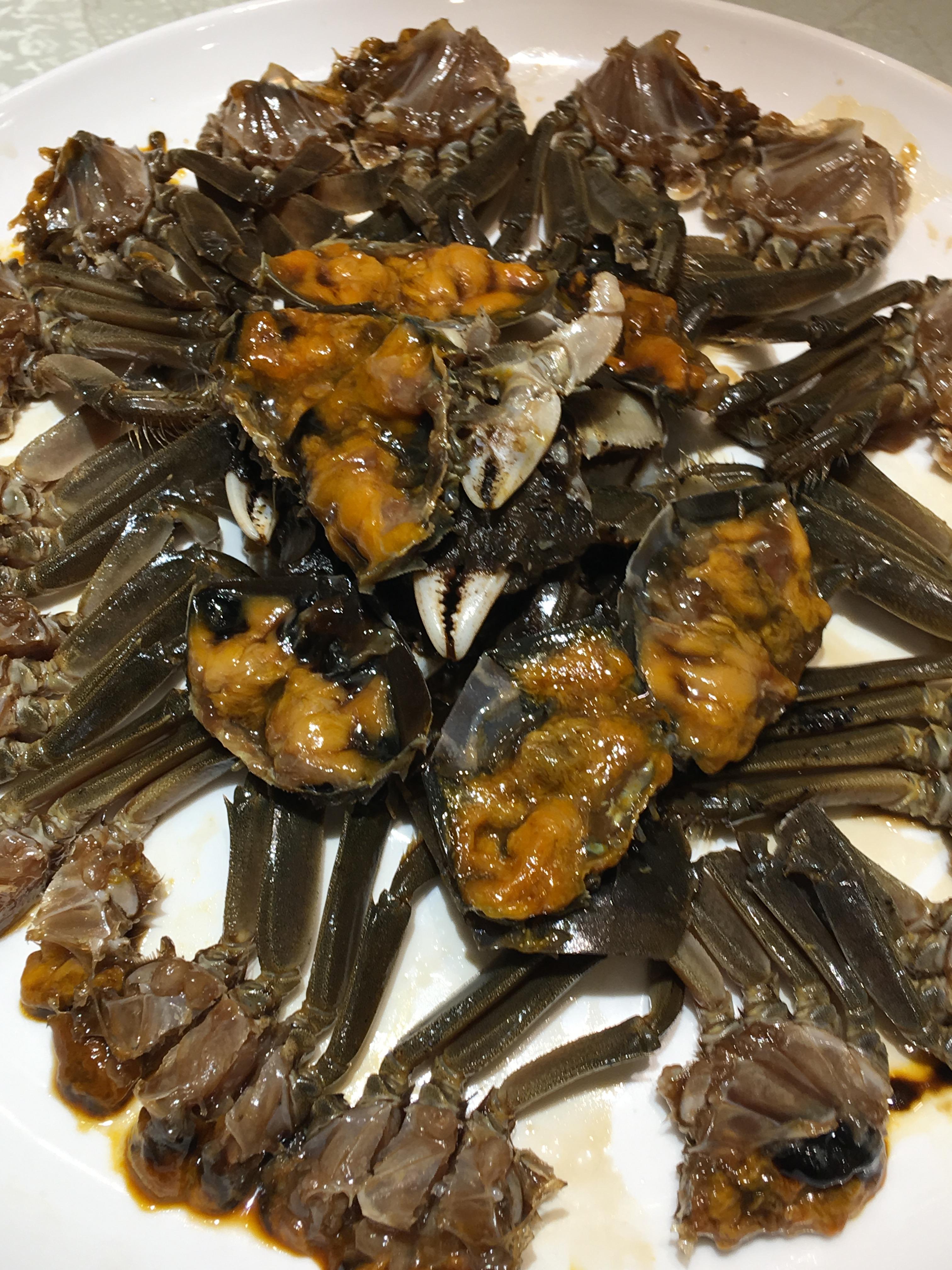 在我的要求下,徐大师又上了一道玫瑰琥珀醉蟹,这是江南爱蟹人士的心头好。对上海人来说,也是性命。上海的本帮饭店里以前也有,近年来因为食管部门管得紧,不再供应。但是在拥有卫生许可证的饭店里还是长销不衰的保留节目。