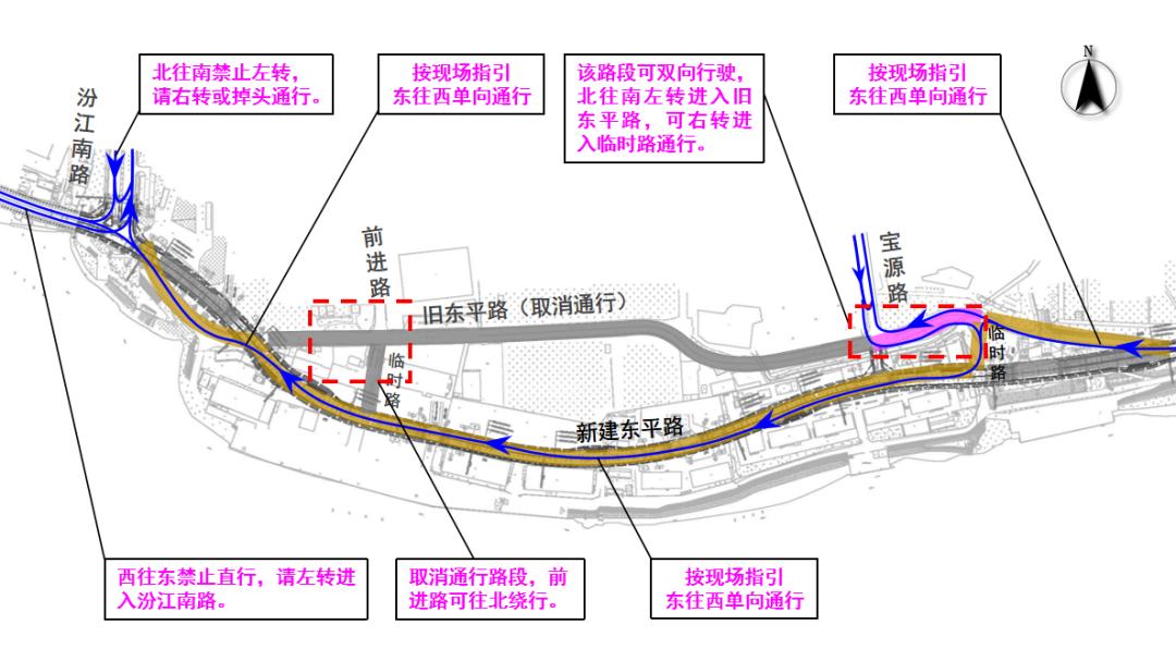 取消临时路(与前进路衔接路段)通行,车辆绕行新建东平路。