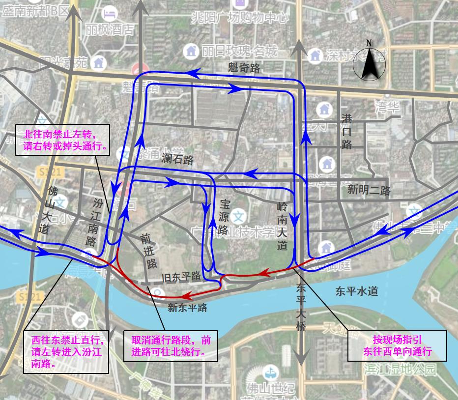 东平路(汾江南路至佛山公园南侧)实行东往西单向行驶,车辆按现场标志标牌指引通行。