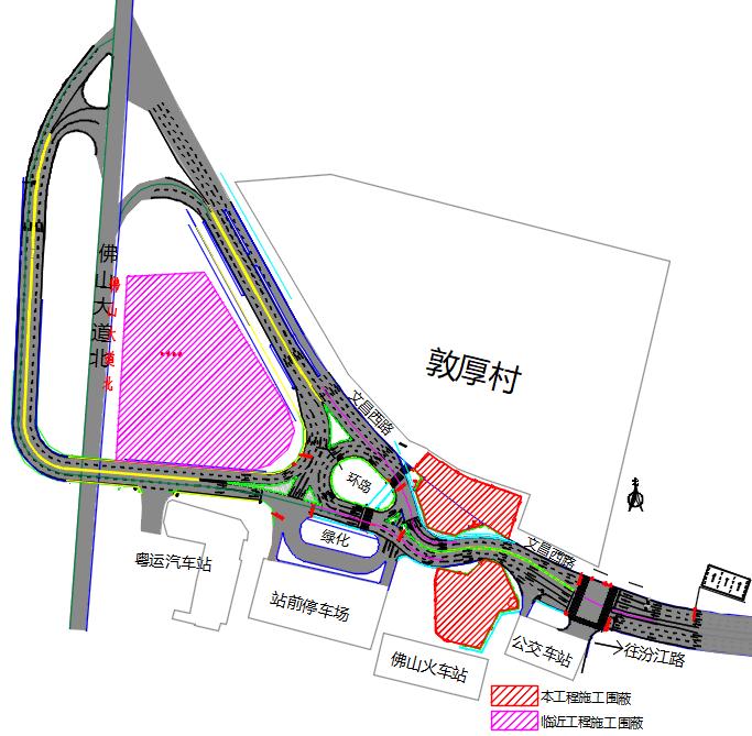 对文昌西路(佛山火车站路段)进行围蔽,文昌西路环岛东侧局部道路由现状东西双向6车道调整为双向4车道。