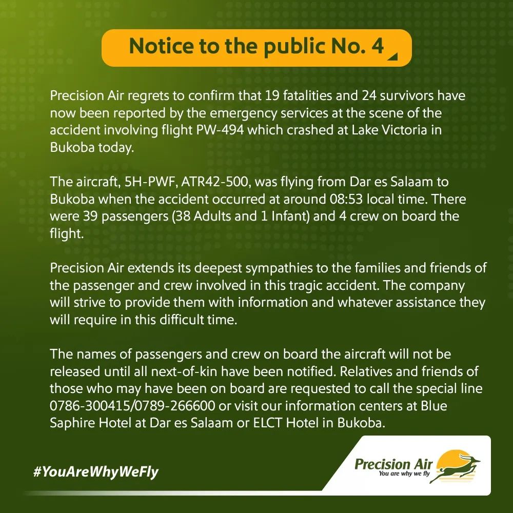精密航空是坦桑尼亚最大私营航空。这架航班号为PW494的飞机当天6时从达累斯萨拉姆尼雷尔机场出发前往布科巴。精密航空机队均由ATR系列涡桨飞机组成。涉事飞机是一架机龄12年的ATR42-500(注册号5H-PWF)。原标题:《坦桑尼亚一客机降落时坠湖 死亡人数升至19人》
