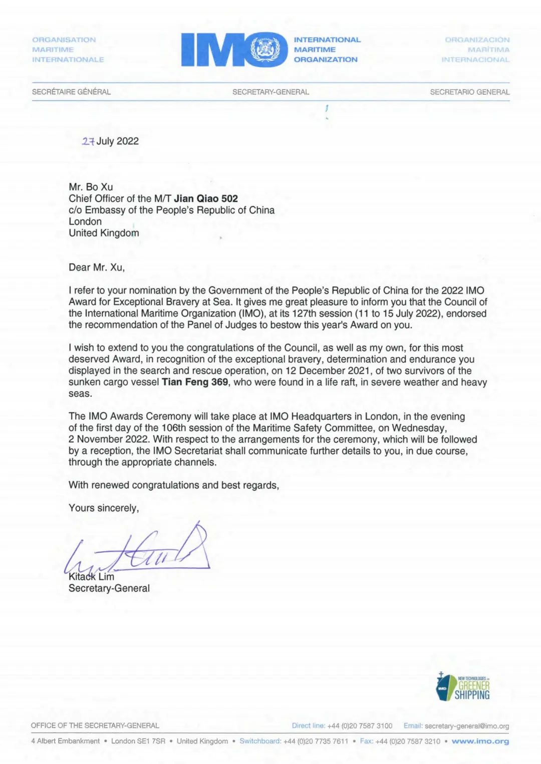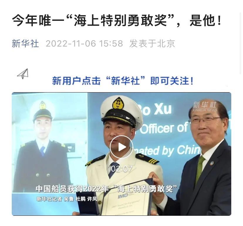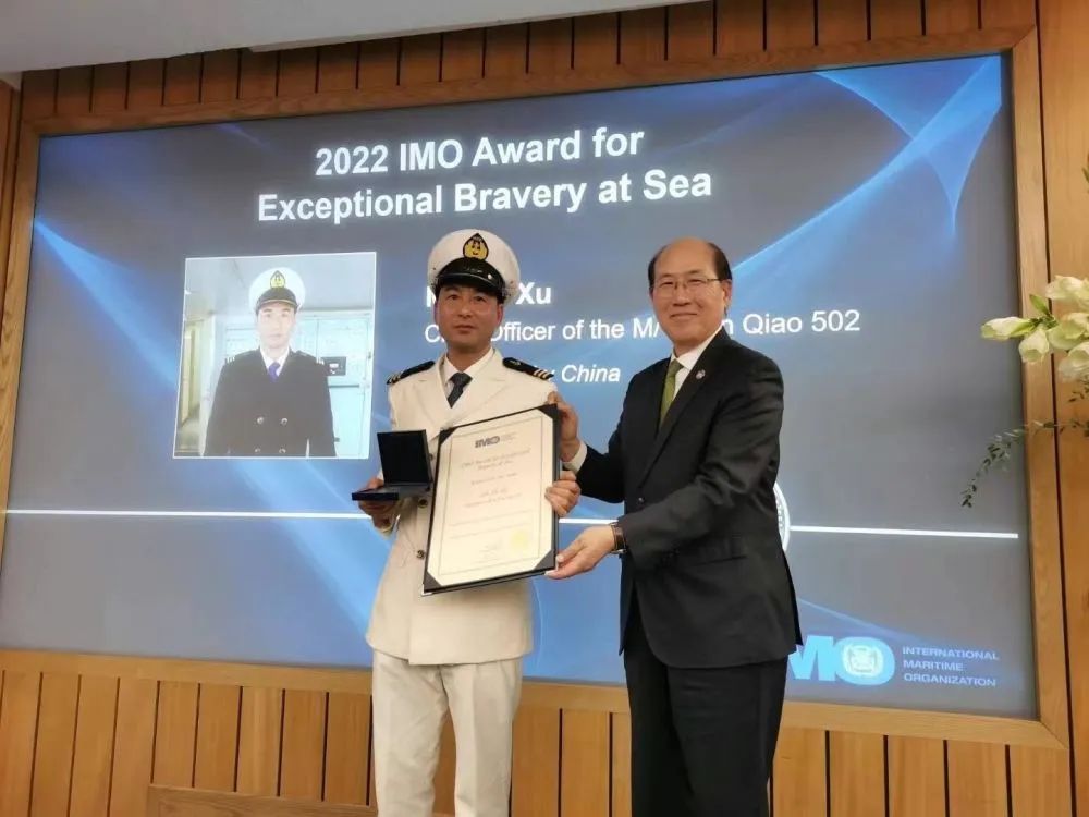 鉴于这名中国大副英勇无畏的救人精神,授予其2022年国际海事组织“海上特别勇敢奖”,以表彰他在营救两名船员时表现出的勇敢、决心和耐力。